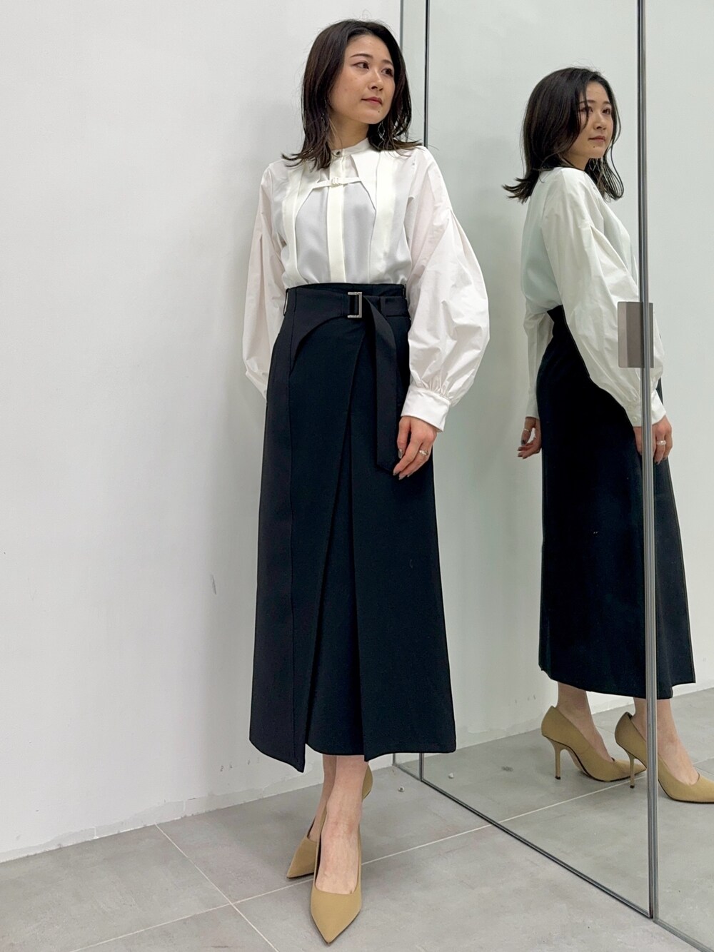 石渡菜月(UNITED TOKYO 池袋 W)のシャツ/ブラウス「【完売間近!】タックレイヤータフタコンビブラウス|ウォッシャブル/ストレッチ」を使ったコーディネート