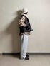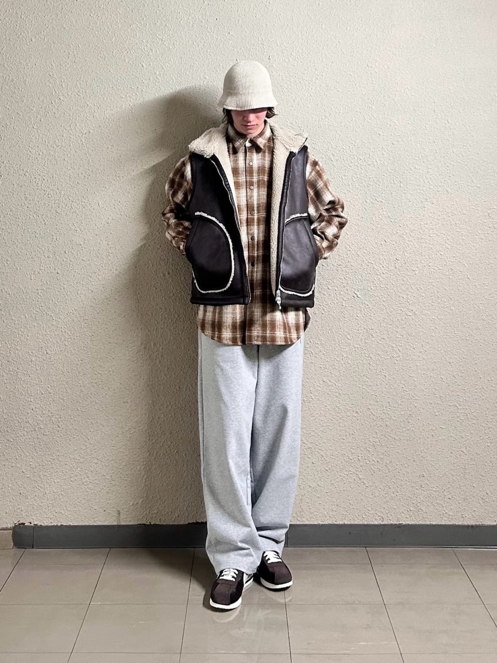 スウェットパンツをベースにしたリラックスコーデ。 チェックシャツにムートンベストを重ねて、 ラフな中にもレイヤードで奥行きをプラス。 トップにボリュームを出して、 シルエットはゆるめのAラインを意識しました。