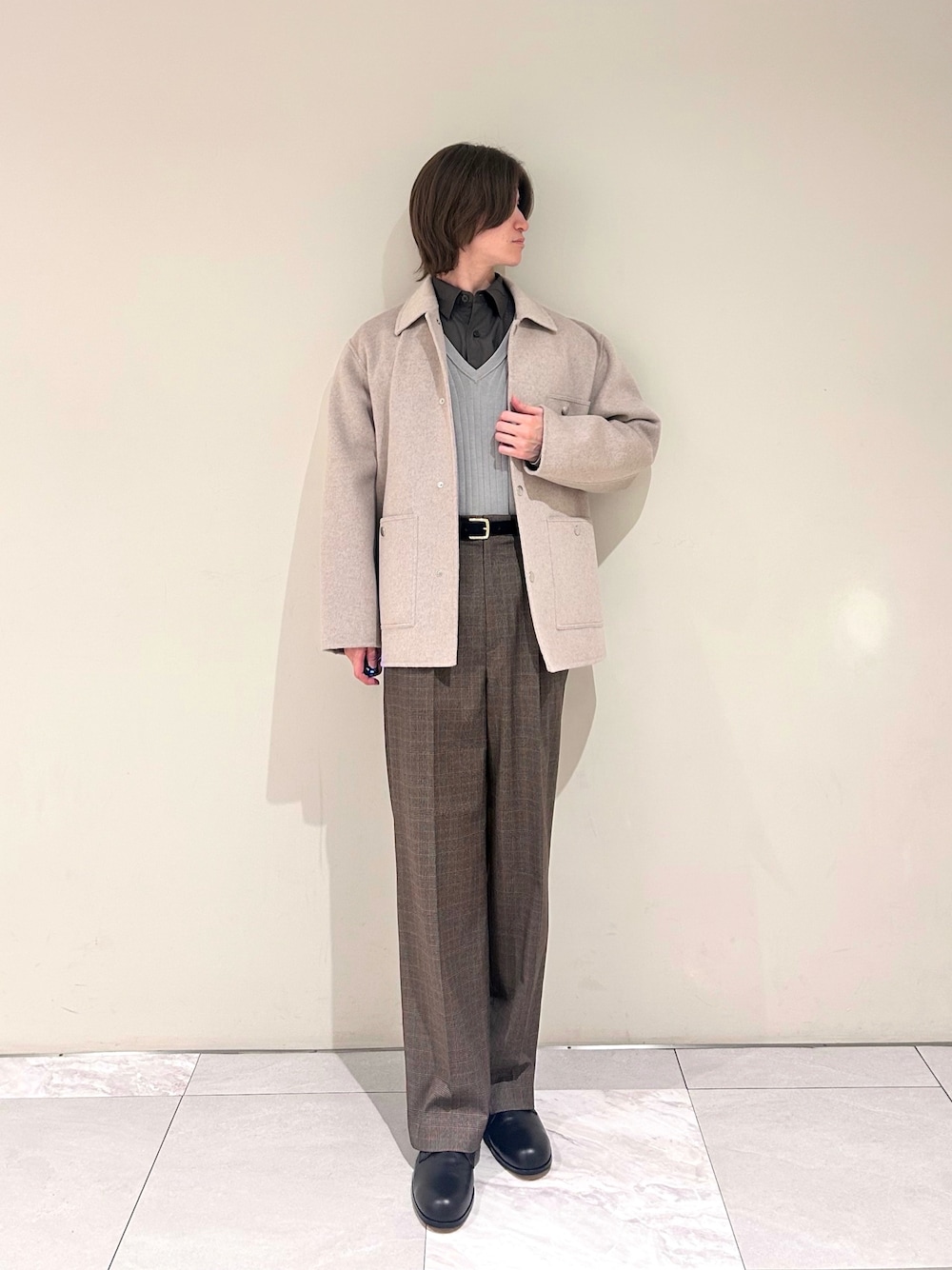 ベージュのカバーオールを主役に、 ブラウンのスラックスで落ち着いたトーンにまとめた春コーデ。 Vネックニットとシャツでレイヤードを作り、 シンプルだけど少し奥行きのあるバランスに。 174cm outer : L knit : M shirt : M pants : L shoes : 42