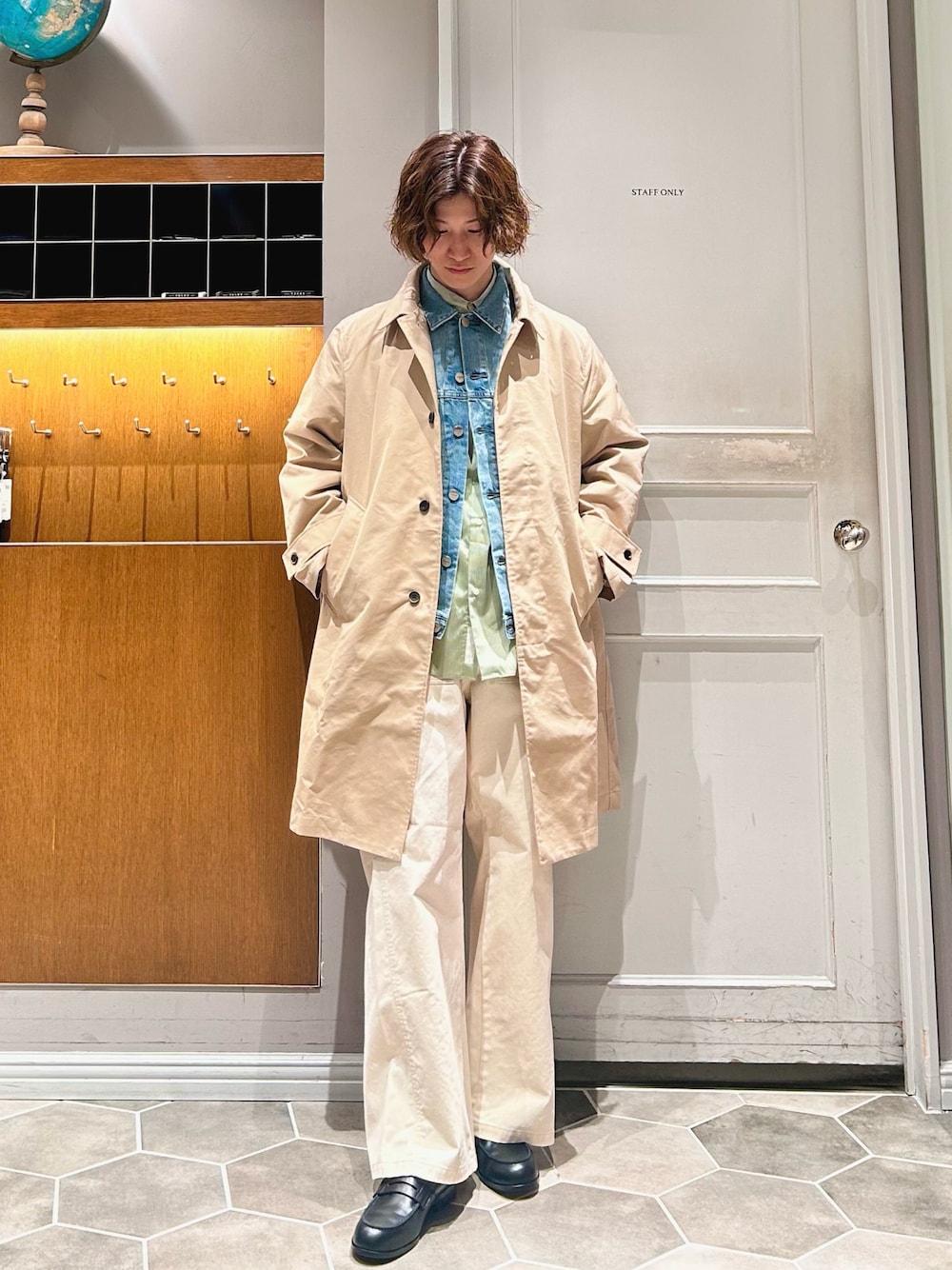ミントカラーの Needlesのシャツ に AUTHENのデニムジャケット を重ねたレイヤードスタイル。 その上からベージュの春コートを羽織り、 全体を柔らかいトーンでまとめました。 ボトムはチノパンでカジュアルさを出し、 足元は PADRONEのローファー で引き締めています。