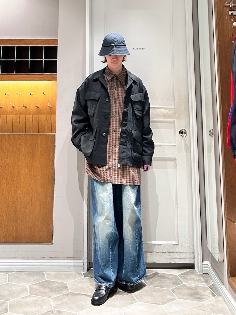 黒のファティーグジャケットを軸に、 チェックシャツでレイヤード。 Needlesのワイドデニムでボリュームを出して、 ラフすぎないように革靴で締めました。 shirt:Marvine Pontiak Shirt Makers pants:Needles hat:COMME des GARÇONS HOMME jacket:NANO universe shoes:PADRONE
