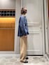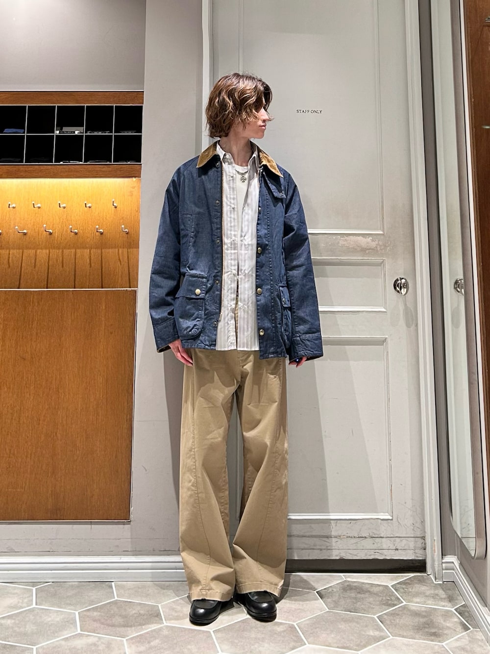 デニムのBarbour(ビデイル型)にベージュパンツを合わせて、 落ち着いたトーンでまとめた春コーデ。 ベルテッドの3Dパンツで立体感と動きを出し、 ローファーで足元に締まりを出しました。