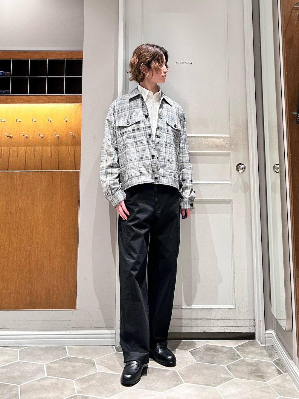 ショート丈で重心を上げ、 ワイドパンツでバランスを取っています。 フレンチリネンの軽さと質感で、 モノトーンに柔らかさをプラス。 シンプルですが、単調にならないよう意識しています。