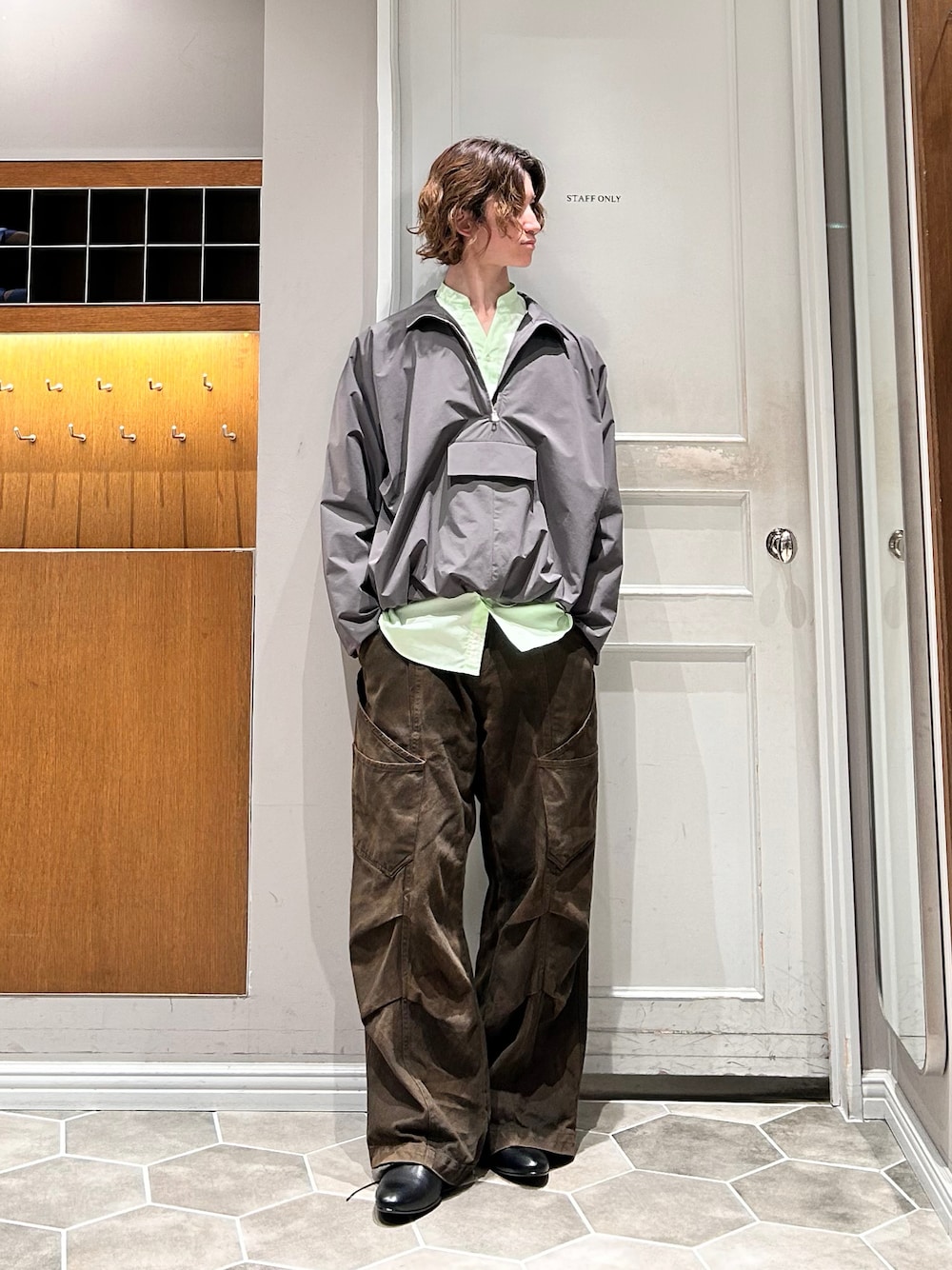 バンドカラーで首元をすっきりさせ、 ナイロンジャケットで軽さを出しています。 ブラウンのコットンカーゴで少し重さを足し、 足元は革靴で全体を整えました。 脱水・防水のあるジャケットなので、 今日のような雨の日でも気にせず着られます。