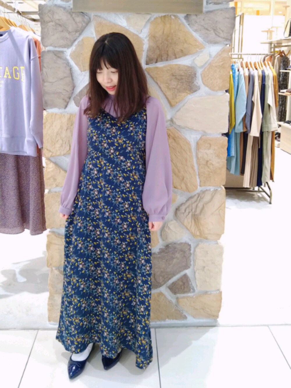お気に入りのキャミワンピースです🌼 他のワンピースと比べるとタイトめで長さ調節できます! ネイビーカラーはとくに花柄のデザインが映えます🌼 色違いのベージュとブラウンも色あざやかでおすすめです! ブラウスは首元がフリルになっていてかわいいですよ✨ 私はブラウスで合わせていますがプルオーバーやニットと合わせてもいいですね✨ 今から長く着れるアイテム&はおり物もたくさん入荷しておりますのでぜひお立ち寄りください😊 ・テレコハイネックプルオーバー 税込¥2,750(1209382/Techichi TERRASE) ・花柄ピーチサテンキャミワンピース 税込¥6,050(1105778/Techichi TERRASE) ・ポインテッドバレエシューズ 税込¥4,950(1813882/Techichi TERRASE)