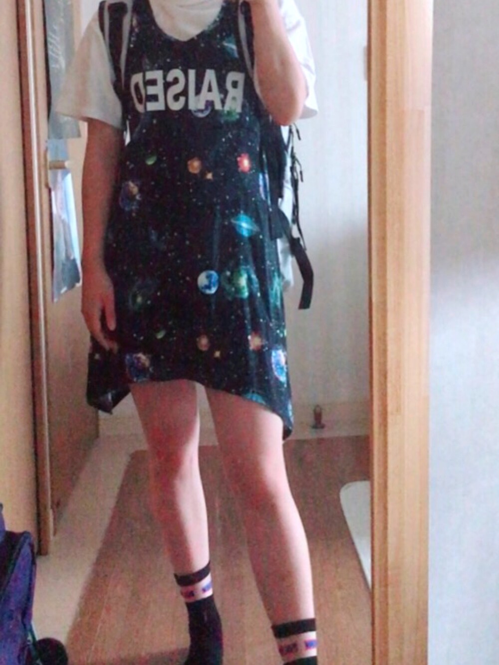 ブラック系のワンピース、ホワイト系のTシャツ/カットソー、ブラック系のソックス/靴下を着用したレディースの夏コーディネートの1枚目の写真