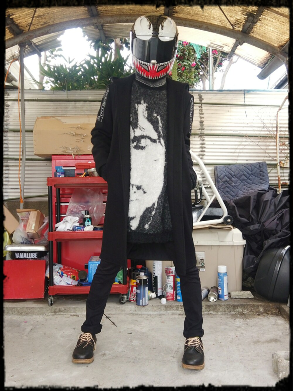 【ご挨拶】 ご覧いただきありがとうございます 毎回いいね・お気に入りしてくれる方もいらっしゃって本当に嬉しい限りです 役に立つコーデとは程遠いですが、皆さまにちょっとでも楽しんでいただければ幸いです 【コーデのコンセプト】 今回はオーバーサイズのニットをメインにコーデを組み立ててみました このニットの下にパーカーやライダースなんかを着てアウターとして使ってオーバーサイズ感を活かすことが多いのですが、今回はコートを羽織ってシンプルにスマートなシルエットにしました 【コーデのポイントと反省】 今回のポイントはニットの柄なのですが皆さん何に見えますか? 実はゾンビの顔なんです! こういうダークな雰囲気のアイテムが結構好きです 反省としては靴とパンツは違うもののほうがよかったかも 【〆】 まだまだ満足できるレベルではないですが撮影にも少し慣れてきて勝手が理解ってきました さらなるクオリティアップを目指していくので、またよかったら見てください