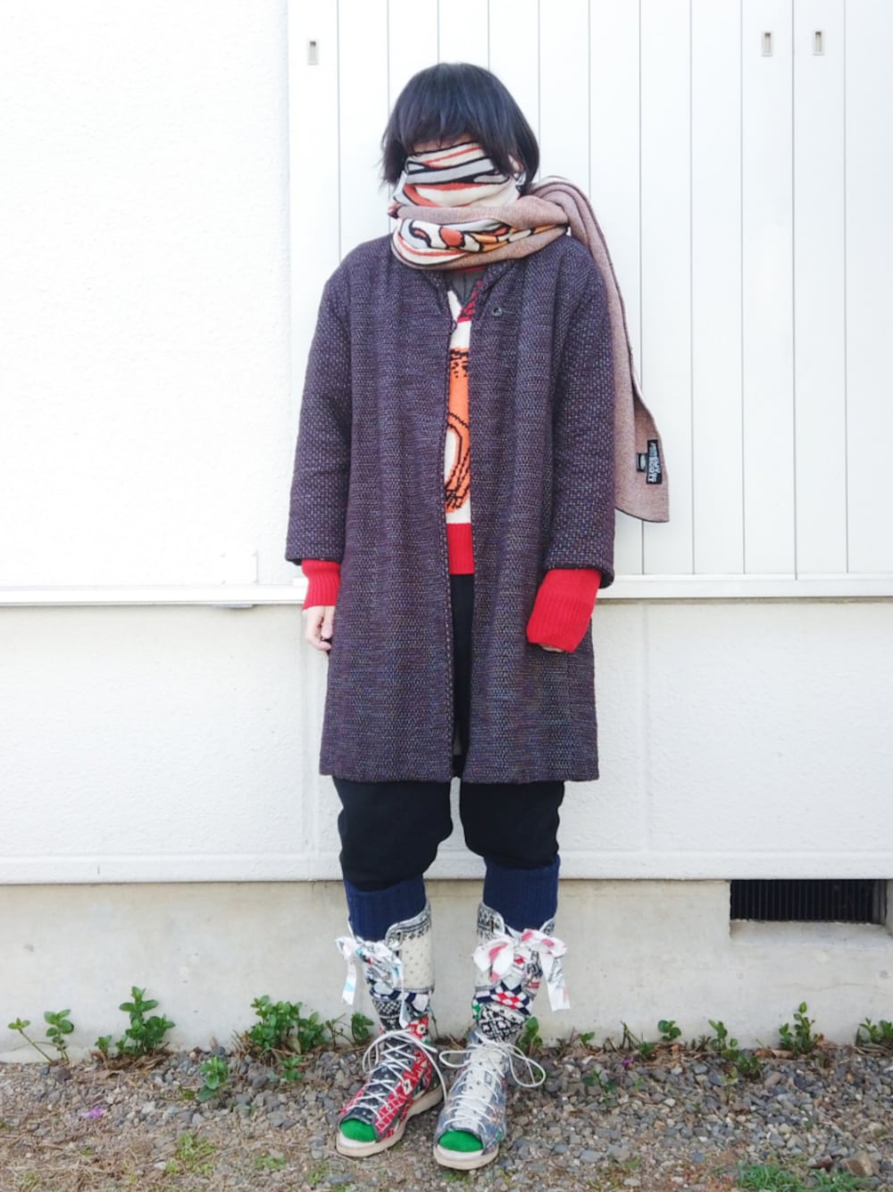 【ご挨拶】 ご覧いただきありがとうございます 年末年始のぐーたらで早起き投稿はもはや不可能になったうつけです 朝寒くて二度寝が捗る…😭 【コーデのテーマ】 今回は初詣をイメージしたコーデを組んでみました もう何年も初詣してない僕なので今年ももちろん行ってないですがあの雰囲気は嫌いじゃないんですよねー もさもさの野暮ったい感じを強調した感じでまとめたのですがなんか農民に変装した忍っぽくなりました(笑) 年末大掃除してたら昔このコーデのコートなしverでストリートスナップを撮っていただいた雑誌が出てきたので小窓に載せときますね この頃今よりかなり太ってて恥ずかしいので顔は厳重に加工しました🤣 まあいわゆる黒歴史というやつですが皆様の笑いのタネになれば幸いです😂 【コーデのポイント】 羽織は久留米絣という着物によく使われる伝統製法の生地で作られたものです とても素朴な素材感がレトロな雰囲気で気に入ってます 防寒的には中綿が少し入っているのでそこそこ暖かいですが、あくまで羽織なので1番上しかボタンが付いてなくて前が閉められないのがつらい(笑) インナーはジャガードニットで花札の鹿の柄になってます 正月といえば花札(?)ということで採用です パンツは以前使ったジョッパーズパンツです 靴と合うシルエットのパンツをと考えたときちょうどよかったのでチョイス ちなみにスナップで履いてるものとは違うものです 靴は冬なのにサンダルってのは面白いかなぁと思って使ってみました 以前クリスマスに使ったルーズソックスにニット素材のサンダルを無理やり組合わせて1つの靴っぽく見せてます まあ足先がめちゃくちゃ冷たいですが我慢です(笑) 普段あまり使わないのですが今回はストールをマフラーのように🌀巻きにして防寒しました これもジャガードで板ネズミとりの柄になってます 謎としか言えない柄ですがそこが気に入ってます そんな感じでコーデ完成です! 【〆】 写真は地味に撮ってあるのでどしどし投稿……できるかな??(疑問) よかったらまた見てください