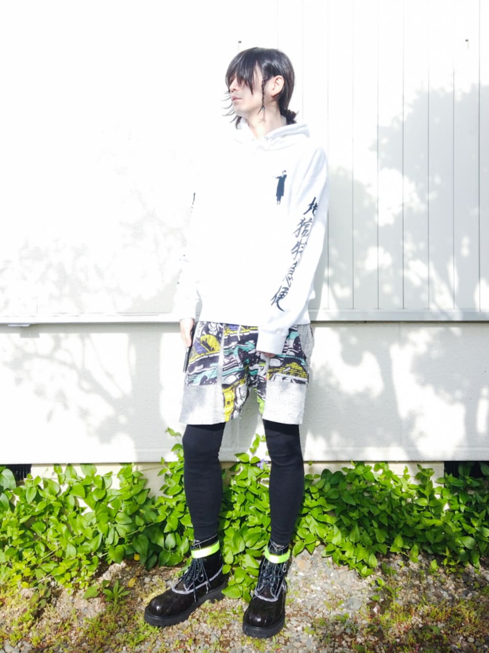【ご挨拶】 ご覧いただきありがとうございます よく行くラーメン屋のポイントがついに貯まってニッコリのうつけです 胸ポケットにかなり貯まってたポイントカードを入れたまま誤って洗濯して紙クズになる悲劇を乗り越えての達成…喜びもひとしおだなぁ😂 【コーデのテーマ】 今回は楽チンカジュアルコーデです 最近この路線も結構ハマってるんですよね 肩の凝らないコーデは好きですがもう全部それでいいじゃんにならないように頻度を抑え気味にしてます(笑) それとフォロワーさんにサイドの細い三つ編みをリクエストいただいていたので珍しくヘアアレンジもしました ただ、まだ髪が短いのと僕のスキルが恐ろしく低いことによりちゃんとした三つ編みがうまくできないので今回はリクエストに応えるというよりもただの練習とその記録です(笑) ~やってみてわかったこと~ ①スタイリング剤である程度毛束をまとめないとブルンッ!ってなって毛束の一つが行方不明になって最初からやり直し ②キツく編み込みすぎると三つ編みの束が反って🦐みたいになって気持ち悪い ③編み込み終わったのはいいけど最後のとこをどうやって固定すればいいのかわからない 特に③は束が細すぎてゴムでうまく固定できなかったので仕方ないので書類を止めるクリップを使いましたがこれは絶対間違ってるよなぁ… どなたかいいアイデアがあれば教えていただけると助かります…(震え声) 【コーデのポイント】 白のパーカーは映画霊幻道士で有名なキョンシーが前と後ろにプリントされています 袖にはF-LAGSTAF-Fというブランドの別ラインであるDelivery Hellsの日本語訳である地獄特急便のプリント入り ちなみにDelivery Hellsは略すとデ…それ以上いけない👩🍳(孤独のグルメ) パンツは以前使ったスウェットのショートパンツです 謎のグラフィックでサルエルのように切り替えられているので動きやすく楽チンです 下にワッフルのレギンスをレイヤードしてアウトドア風に 靴はパンツのイエローを拾ってストラップ付きのビーンブーツを合わせました パンツ×レギンスのアウトドアテイストとも合ってていい感じ そんなこんなでコーデ完成です! 【〆】 次は週末に投稿予定ですのでよかったらまた見てください