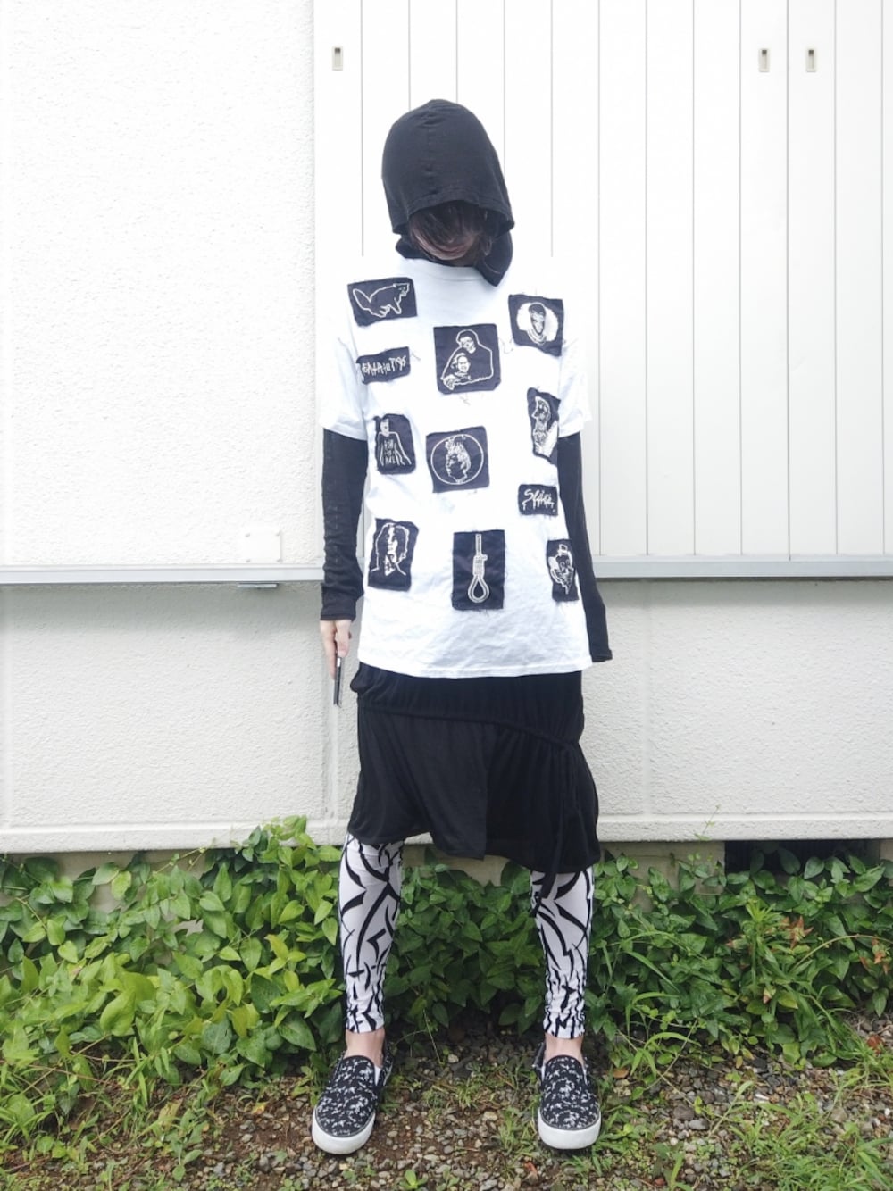 【ご挨拶】 目に留めていただきありがとうございます ちょっと前まですごく暑かったのが急に涼しくなり寒暖差でなんか体がダルいうつけです😂 でも家の片付けはかなりはかどりました✨ きちっと収納した服って着てしまうとまた洗濯して戻すの面倒だから結局着なくなりがち(笑) 【コーデのテーマ】 7(以下略)6日目! 今回のテーマは『楽チンストリート』です アイテム数をできるだけ減らしてモノトーンでコーデを組んでみました 縦長のシルエットを意識したのですが後ろ姿のシルエットなんか比率がおかしい😅 あと髪結んでる部分がパーカーの下からボコッってなってる(笑) 【コーデのポイント】 主役のTシャツはホラーパッチ付のビッグTシャツです 以前同じシリーズの黒スウェットを投稿しましたが白のボディだとパッチが目立ちますね わかりにくいですが結構ビッグシルエットなTシャツなので1枚で着てもなかなかよきです インナーに着たのは薄手のガーゼのようなパーカーワンピースです とても不思議な形をしていて下の方に通ってる紐をウエストの辺りに持ってきて絞るとまた違ったシルエットになります 今回は絞らずにストンとした感じで着てみました レギンスはトライバル柄のものでモノトーンに映えるかと思って採用しました この部分って意外と日光が当たるので紫外線対策も兼ねて 靴はストリートな雰囲気のスリッポンをチョイス 色もモノトーンのものを選び全体に合わせました 靴下もローファーソックスにして足元をスッキリ涼しげに そんなこんなでコーデ完成です! 【〆】 明日はとうとうこの企画最終日! 勝ったッ!第三部完!👈🚘(フラグ) よかったらまた見てください ~私信~ ぱぱさんへ わざわざご丁寧にご連絡ありがとうございます😂 ご投稿楽しみにしていますねっ🤗✨