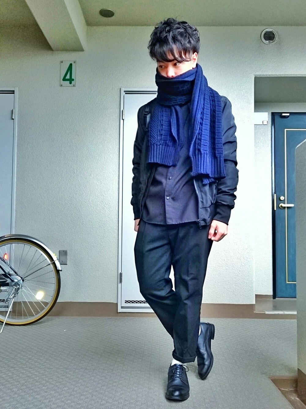 全身ブラックコーデです ナイロンジャケット以外をHAREで揃えました バックパックもオールブラックです マフラーの紺色と靴下の白色で重たくならなすぎるようにしています 地味に白のタートルネックを中に着てます よかったらいいね、saveよろしくお願いします🙇