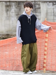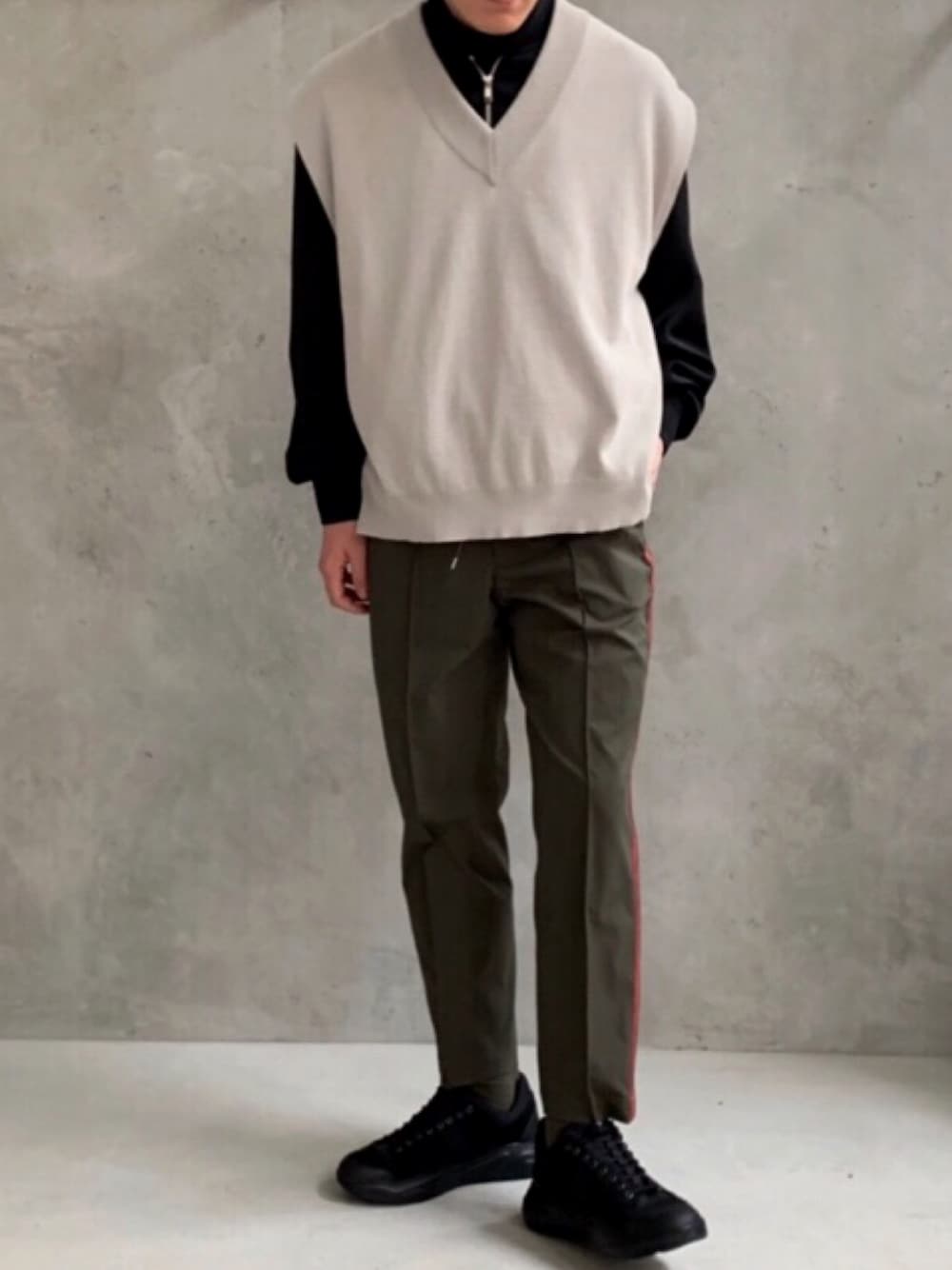 . スポーツミックスにベストのアソートが少し新鮮🤤 パンツはトラックパンツというよりかっちり目のスラックスらしいシルエット。整頓しつつ遊びのある仕上がりです。 靴はデザインあるけど、一見がシンプルだから合わせやすいです。
