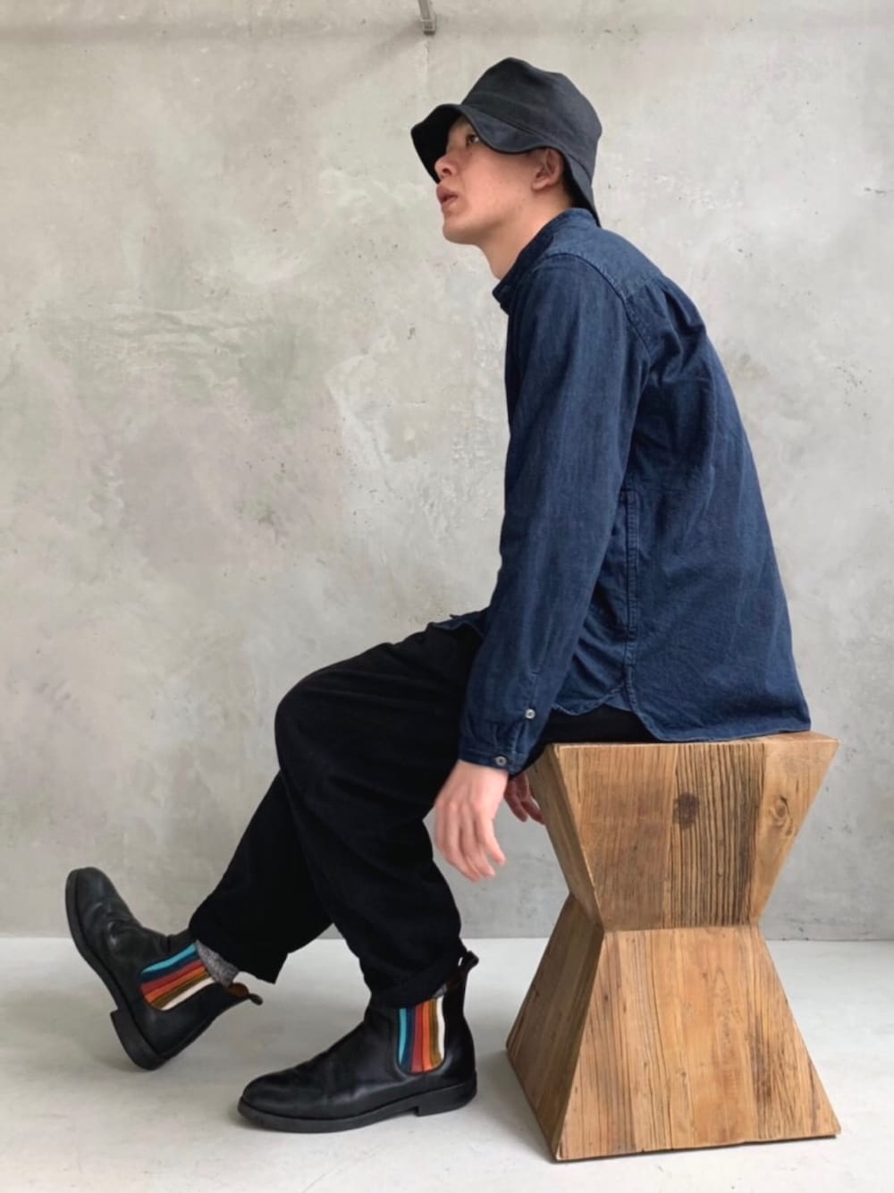 . デニムシャツに黒パン。 シンプルなコーデなんだけど、 麻のハット コットンリネンのデニムシャツ シルクのパンツ それぞれの素材感がじわじわと主張する素材軸なコーディネート。 素材や質感の組み合わせは色合わせより自己満足になりやすいですが、その追求もまたファッションの醍醐味。 靴の七色がさりげなくアクセントになっていてこなれ感も⤴︎⤴︎