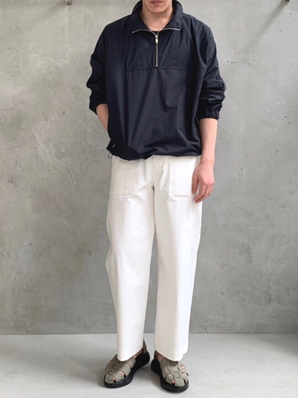 . ゴルファーより、程よく着崩してリラックスした着こなし🤤 配色はモノトーンですが、直球的でない淡さのある白と黒の合わせは凄く自然体です。 インパクトのあるワイドシルエットのパンツにグルカシューズのアソートは抜け感、涼感も演出してくれます。