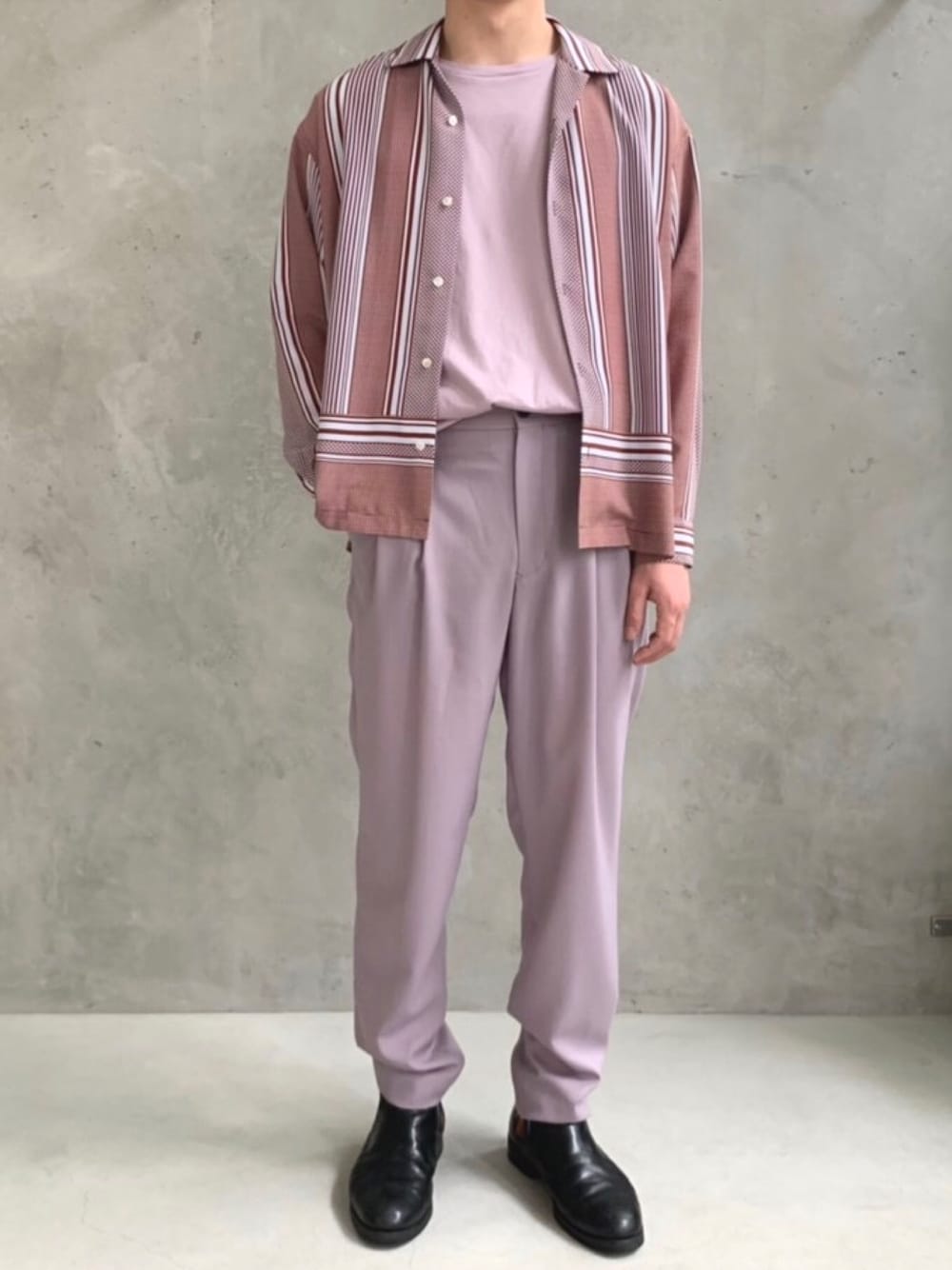 . . 少し挑戦的なペールカラーのコーディネート。 組み合わせこそシンプルですが、他にないカラーコーディネートと質感のしっとりさが大人らしく映えます。