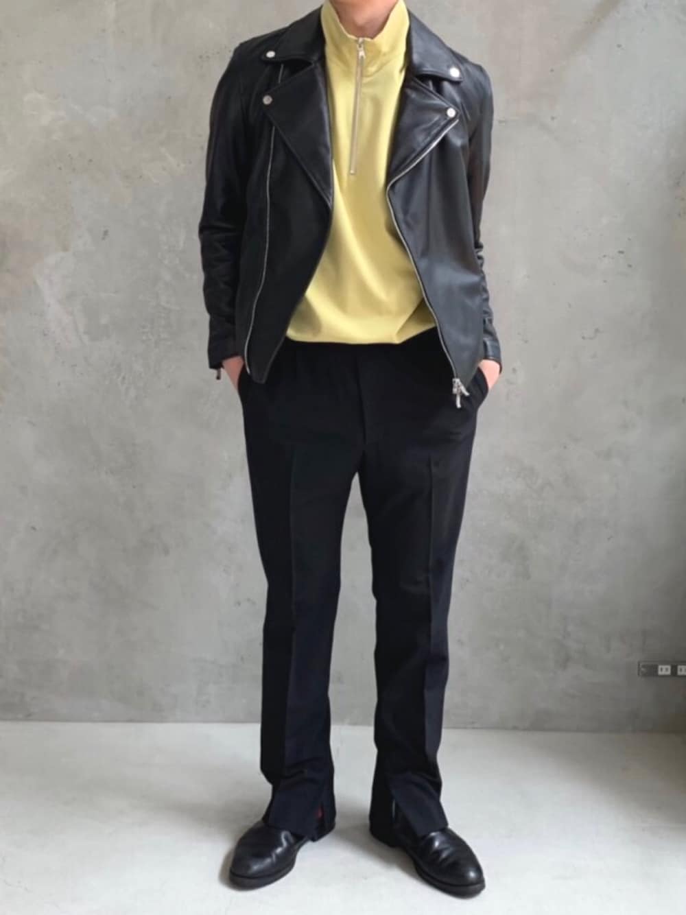 . . くすみとドライな質感のインナーが上着やパンツのディテールや質感を際立たせてくれます。 レザージャケットにブラックパンツのオーソドックスな組み合わせですが、パンツのフレアなシルエットやレザーの程よいゆとりが少し新鮮です。