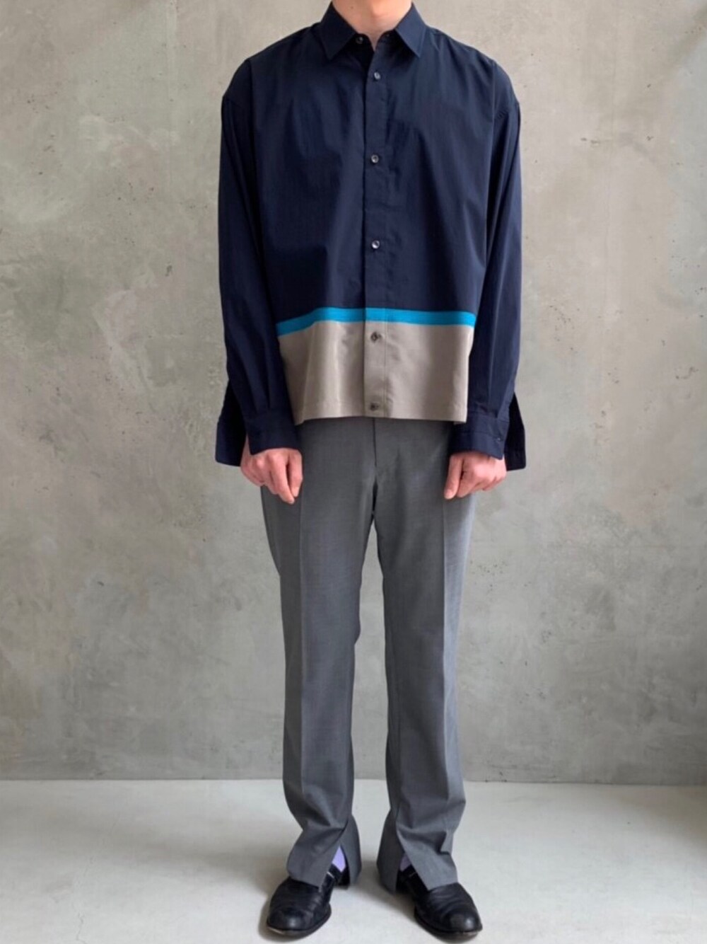 . . Instagram → mmm_yohe カジュアル過ぎず、少しきちんと整頓された質感を組み合わせてシャツのデザインをしっかり馴染ませています。 パンツのスリットに合わせ、袖のカフスを解放し、全体的なデザインにも統一感も演出しています。