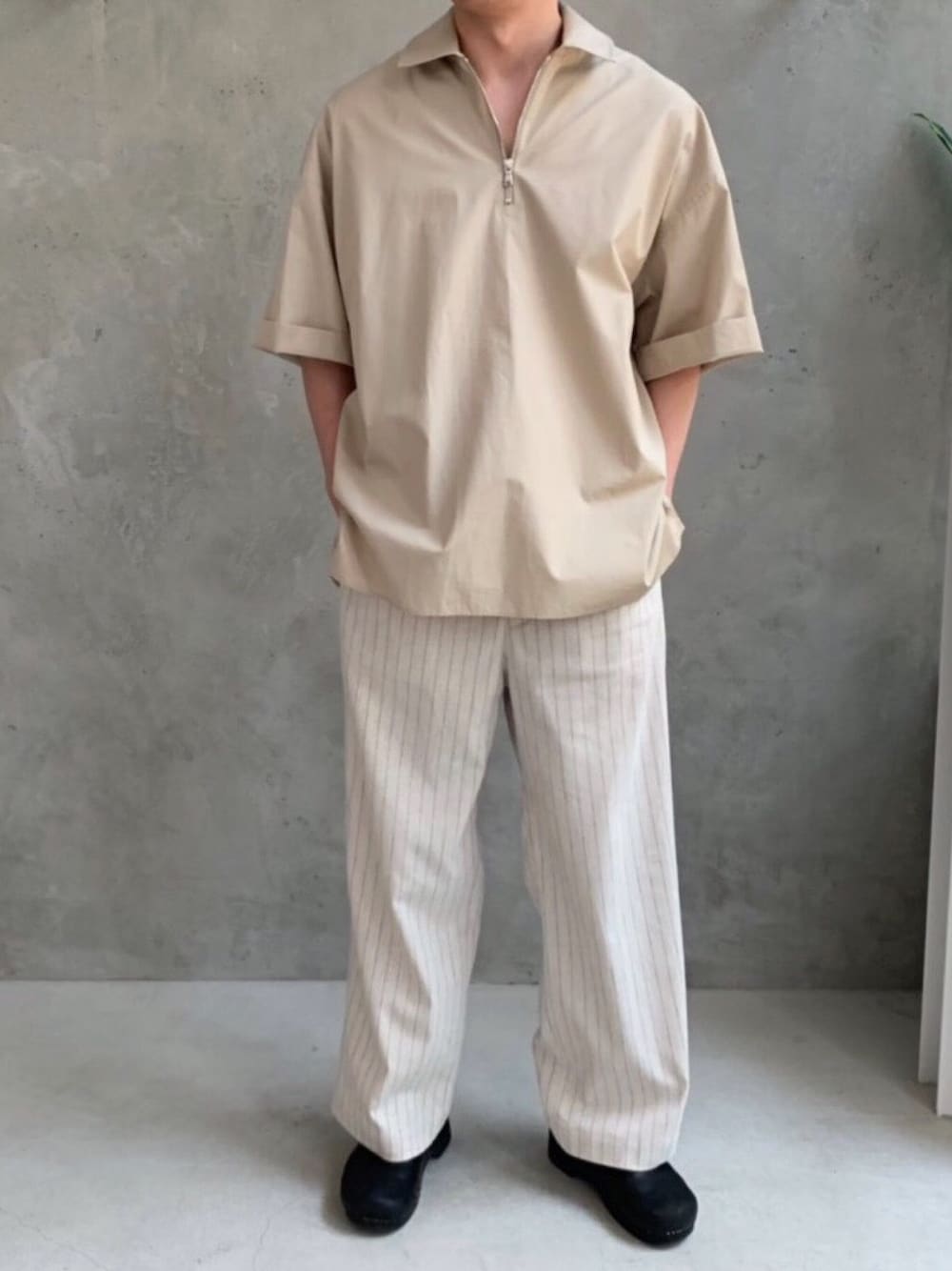 . . さっぱりとしつつ大人らしい質感を大事にしたリラックスコーデ。 シャツはTHOMAS MASONのドレス生地でゆったりしたスキッパーなのがギャップ。光沢や影がエレガントですが、アウトショルダーがラフな印象。 パンツもシャツの裾幅を意識して、太くてしなやかな質感をアソートしています。 同色の組み合わせですが質感や些細なストライプにこなれがございます。