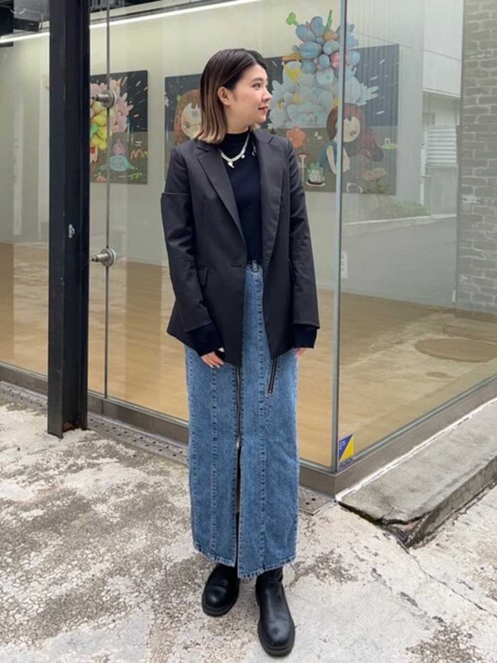 トレンドのデニムスカートで大人女子コーディネートに。ベーシックなシルエットのジャケットをデニムスカートで合わせることでカジュアルながらもきちんと感を演出。ウエスト位置が内側に絞られているのですっきりと女性らしさのあるシルエットです。