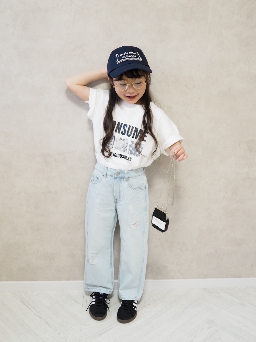 LOWRYSFARM KIDS♡´、 ________________________________ ◻︎ フォトプリントT 324933 color: オフホワイト size:120 ◻︎ デニムストレートパンツ 254498 color: ライトブルー size:120 【6y / 116cm / 18kg】 1枚あると着回し無限のフォトTシャツ♡👕 シンプルにdenimと合わせるだけで🙆♀️✨ デニムパンツは程よいワイドでダメージ加工もかわいい♡何よりシルエット最高です♡