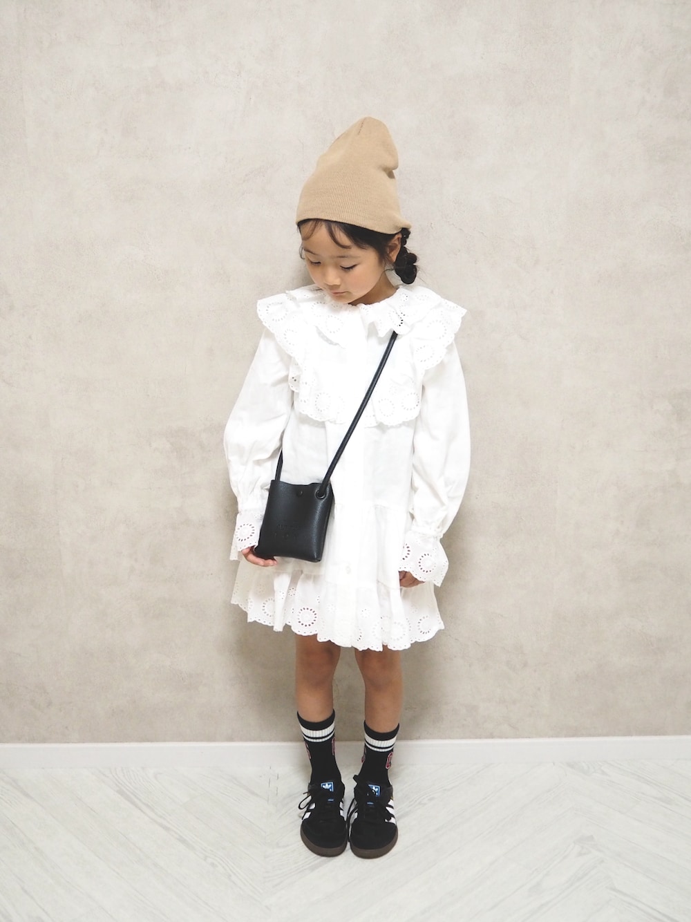 🌼◯🌼◯⚪︎。 ________________________________ ◻︎ スカラレースワンピース 578282 color: ホワイト size:120 【6y / 118cm / 18kg】 たっぷりのレースが甘々なワンピース👗’’ 小物次第で印象がすごく変わるよ♡ 今回はビーニーとスニーカーとラインソックスで🧦甘すぎないコーデにしたよ🤍 スウェットにレイヤードしても絶対かわいい😍♡ 上着必須になったらレザー系と合わせても着てみたい🤤♡