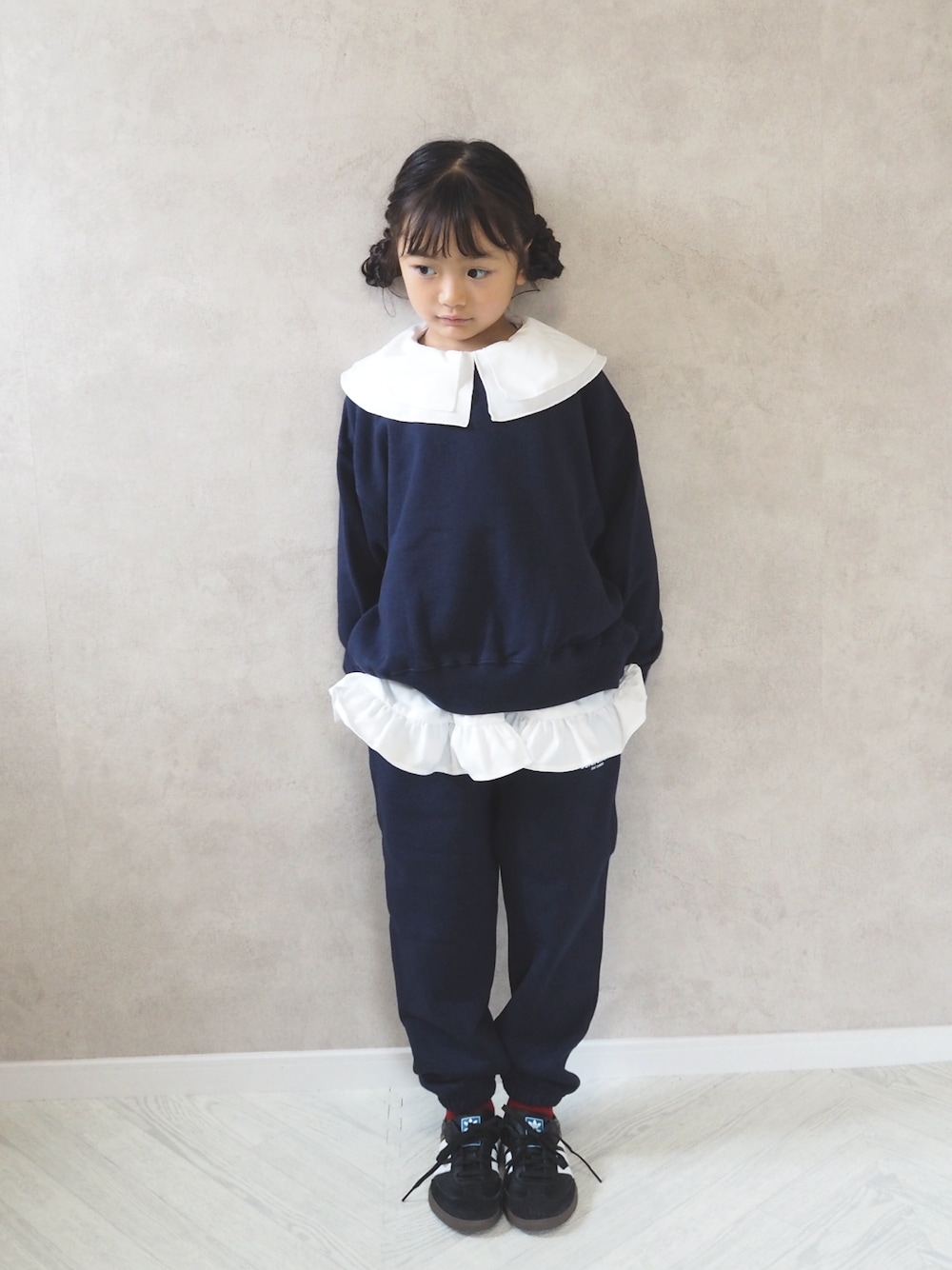 autumn style.💙◯⚪︎。 ________________________________ ◻︎ドルマンウラケプルオーバー 581206 ◻︎ウラケジョグパンツ 581218 color: ネイビー ◻︎ フリルカラーチュニックブラウス 578272 size:120 【6y / 118cm / 18kg】 LOWRYS FARM定番のゆったりスウェット♡ 去年はgray🩶をgetしたけどnavy💙かわいい😍´、 そしてお袖がドルマンになっていてシルエットがより良い♡✨ 甘めカジュアルだいすき♡