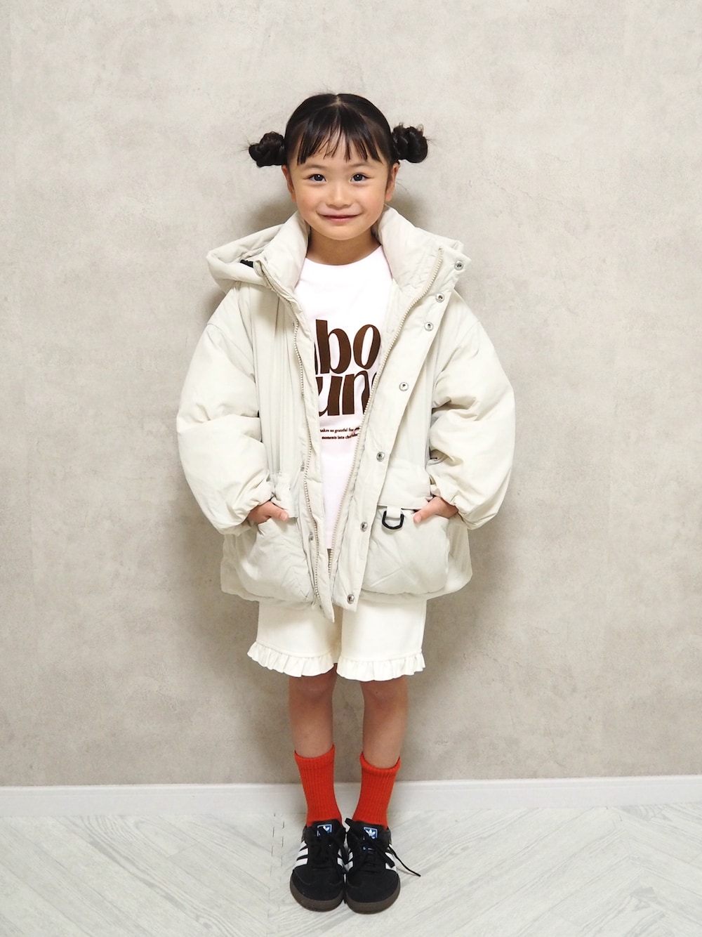 autumn style.🤍◯⚪︎。 ________________________________ #pr ◻︎エアサーマルフードブルゾン 494500 ◻︎プリントロゴTLS 581452 ◻︎フリルショートパンツ 599475 size:120 【6y / 118cm / 20kg】 エアサーマルアウターの中はアソートロゴtシャツ🩷'' アウターがあったかくてこれでいけちゃう♡