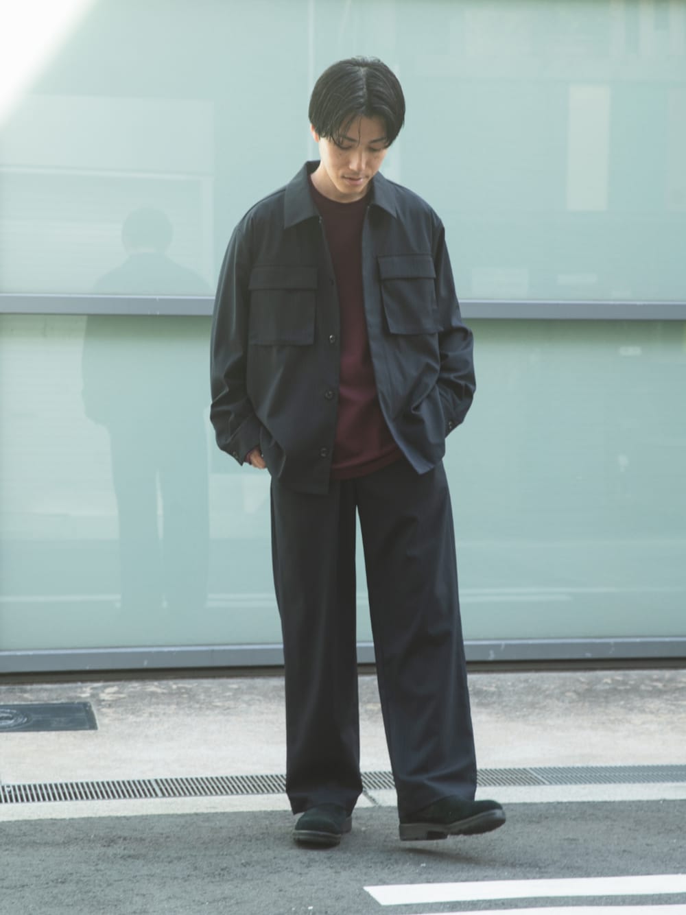秋冬らしく落ち着いたトーンでまとめたセットアップスタイル ジャケット 程よくゆとりのあるシルエットで合わせやすく、マチのあるポケットが立体感を演出してくれます。目立ちすぎないピンストライプがアクセントに。 トップス さりげない上品な光沢感と、ハリ感を併せ持った、一枚でもサマになるロンT。シンプルで使い勝手抜群。 ボトム ちょうどよいゆとり感のあるシルエットで汎用性抜群。ストレートシルエットで合わせやすく。ピンストライプがアクセントになります。