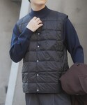 アウター 日本を代表する毛織産地「尾州」で織り上げたウール生地を使用したショートコート。ふくらみのある風合いと、自然に落ちる柔らかなシルエットが魅力です。過度な装飾を抑えたクリーンなデザインで、ニットやシャツにさっと羽織るだけで品のある着こなしに。長すぎない着丈がバランス良く、デイリーから少しきれいめなシーンまで幅広く使える一枚です。 インナーダウン 定番のTAIONダウンベスト。軽快な着心地で秋冬シーズンを通して活躍するダウンベスト。クルーネックのすっきりとした首元と、ミニマルなボタンダウンデザインで汎用性が高いアイテム。ジャケットやコートのインナーダウン使いにも便利で、着こなしに奥行きをプラスしてくれるレイヤードアイテムです。