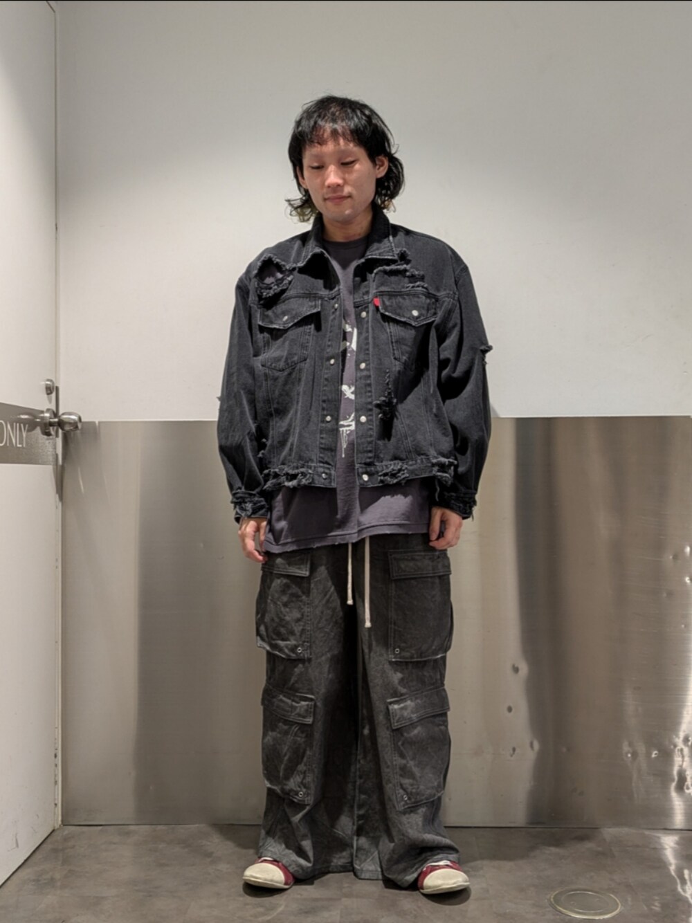短丈のデニムジャケットに激しいダメージ加工を施し、背面にはSPACE SONICとリベットをあしらった主役アウター 同ブランドのオーバーサイズTやバギーパンツを合わせると雰囲気バツグンのルックになります!