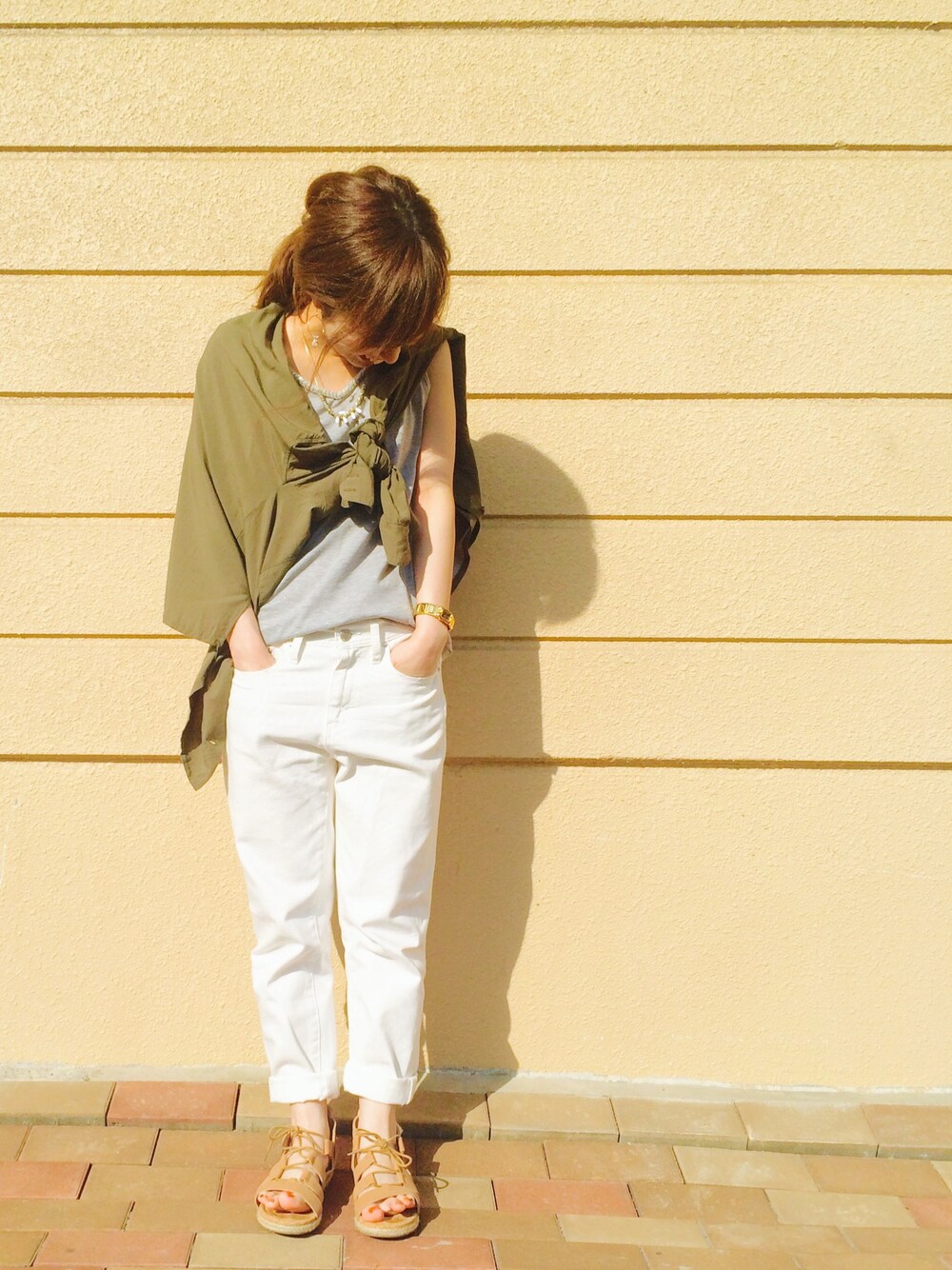 こんにちは〜😊 グレーのタンク×ホワイトパンツのシンプルな合わせに、カーキのシャツを肩掛け♬ タンクはプチプラなんですが、ビジューがついていたりVネックなところが、すっきり着れるので使いやすいです☺️ 柄を入れずに大人な雰囲気を意識してみました〜😊