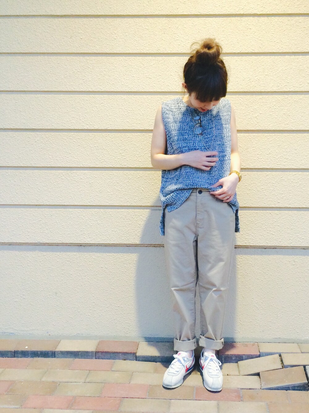こんばんは♬ たびたびすみません〜😂 ニットベスト×チノパン 前回の色違い♬ グレーのベストは、ベージュのチノパンに合わせました やっぱりうしろのデザインが好きです♡ ニットでもノースリーブだといまの気温にちょうどよくて、最近たくさん着ています😚 なぜかネックレスを隠してしまっていますが😂笑、このネックレスもグリーンがかわいくて最近のお気に入りです😊♬