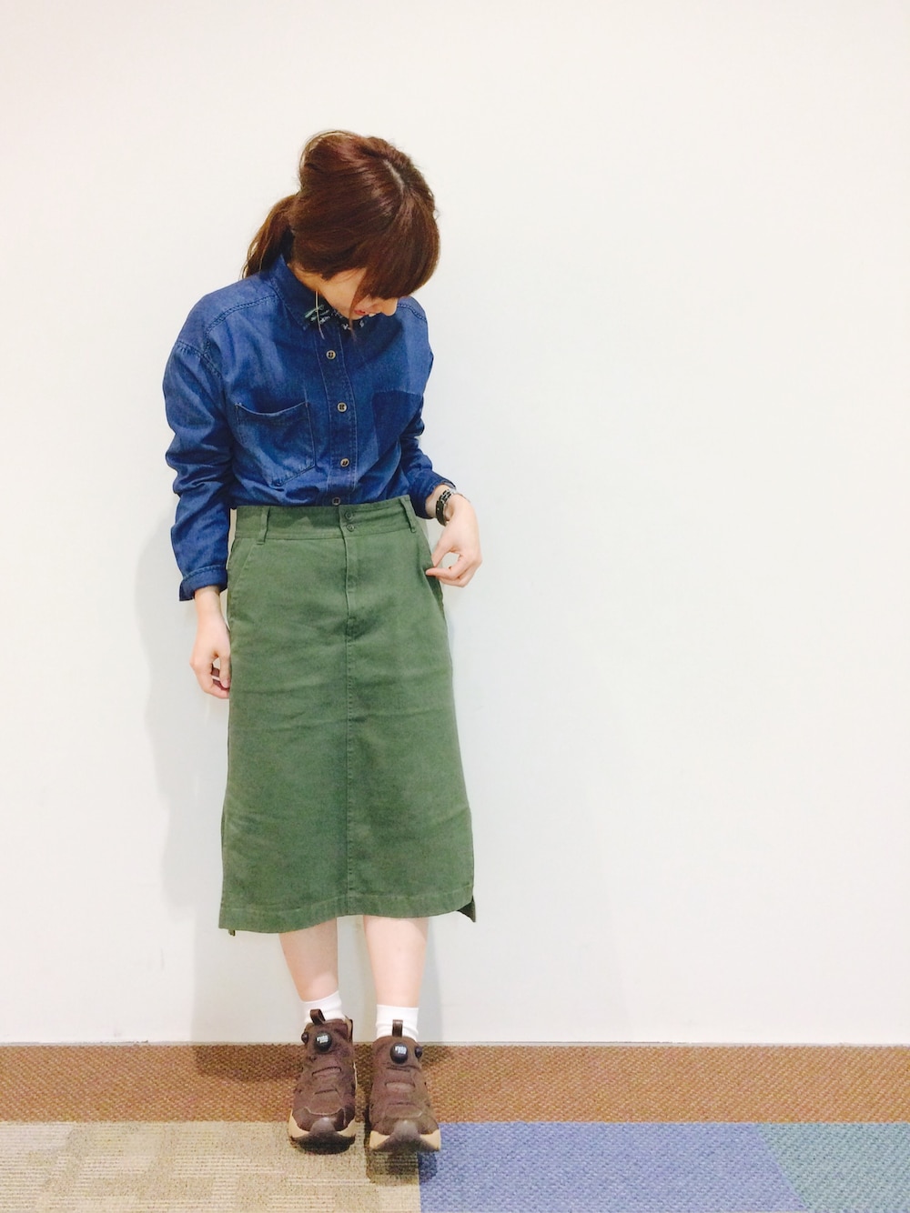 こんばんは☺️ デニムシャツ×ミモレ丈スカート×蝶ネクタイ デニムシャツ、裾がフリンジでかわいいのですが今回はインで使用 スカートは履きやすい丈感、スリット入りで横から見てもシルエットがきれい 色ちがいもほしい…🙂🙃♡ ポイントに蝶ネクタイ♡ キッズ用の蝶ネクタイですが、ネイビー×カーキのスタイリングをうまく繋げてくれました☺️