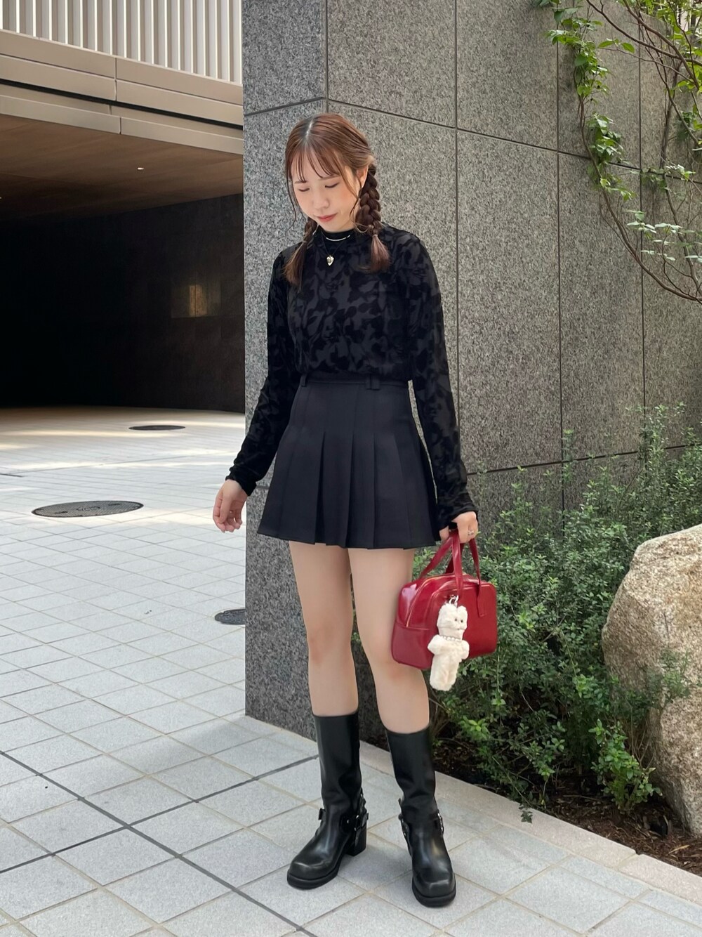 ベロア生地のトップスは高級感あって好き…♡ 黒でまとめて差し色に赤入れてみました🍒