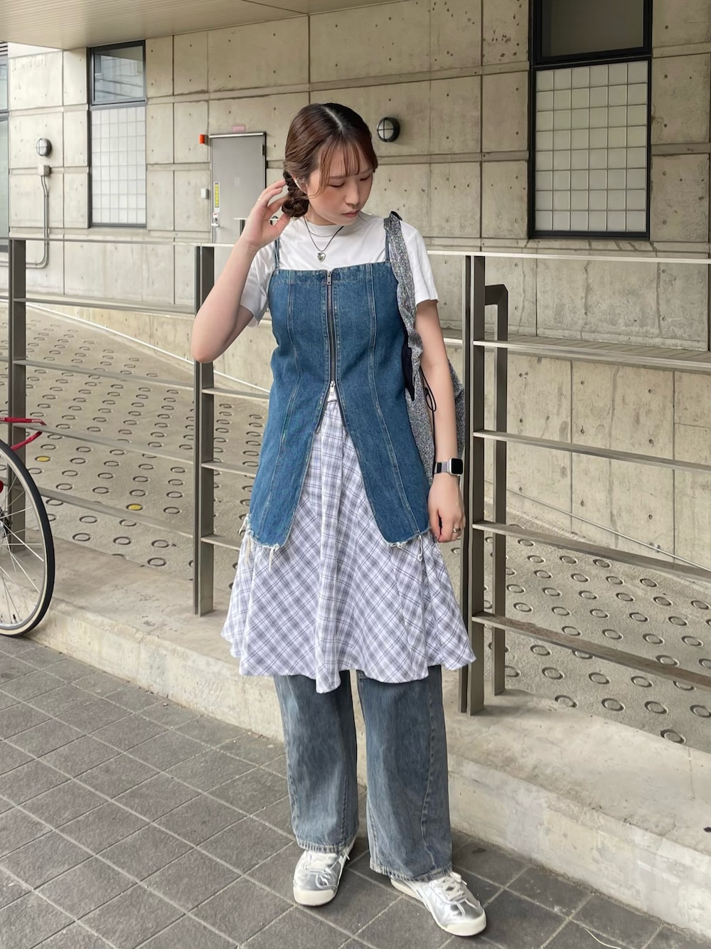 夏はレイヤードコーデがしたくなる🧚♀️✨️ デニム×チェックの組み合わせがお気に入り♡ パンツとのレイヤードアイテム 沢山集めたいっ!🫶🏻