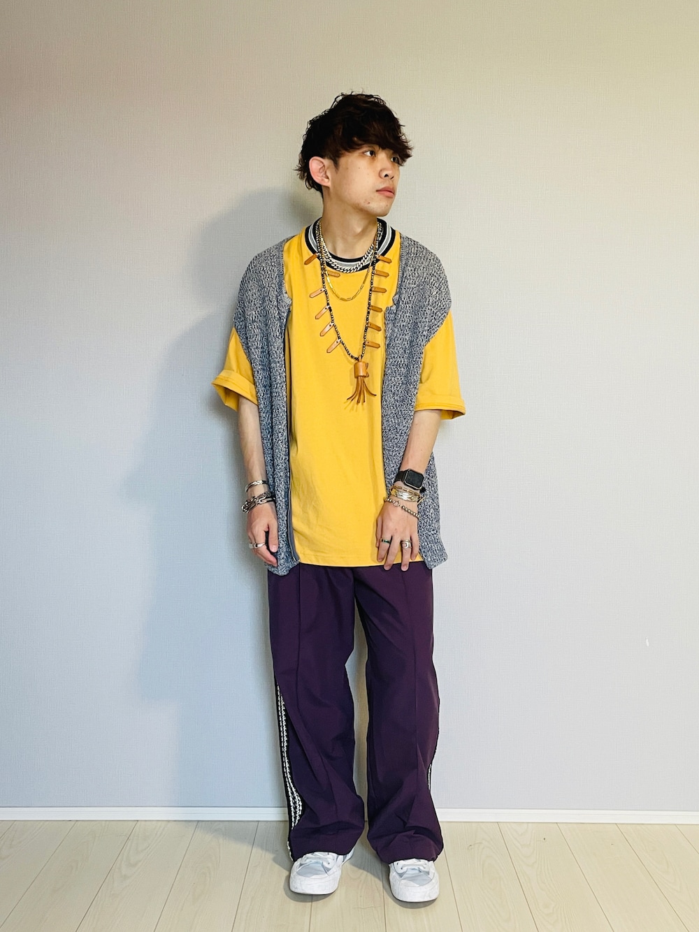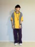 ご覧いただきありがとうございます🍀 パープルに相性のいいイエローを合わせました(*^^*) トラックパンツにTシャツとカジュアルな組み合わせなのでニットベストを合わせてキレイめとのバランスをとりました⚖️
