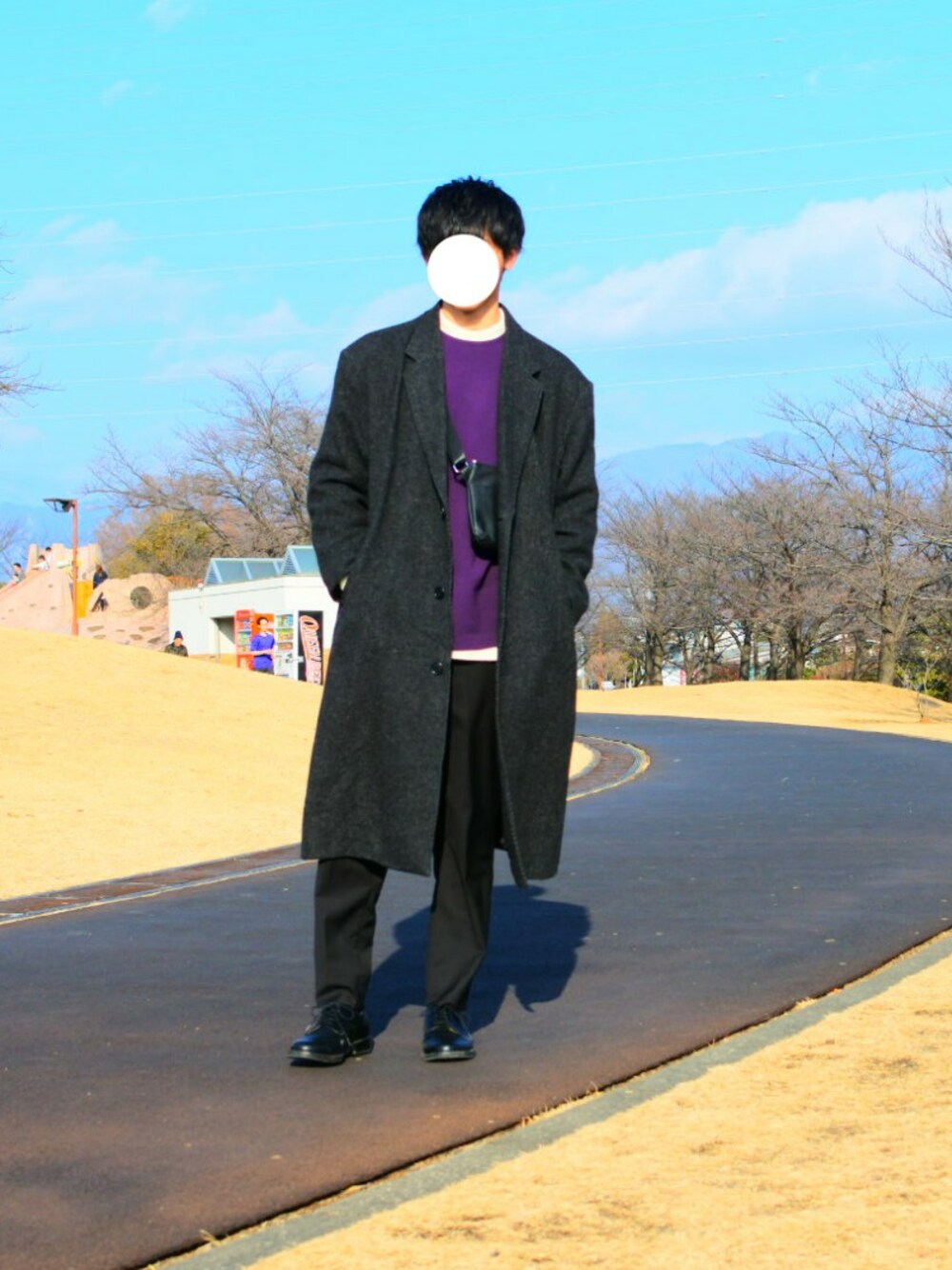 古着屋でなんと2300円のオーバーコート😙 HAREのパープルのニットめっちゃ質良くて気に入ったb モックネックのニットでレイヤードも。