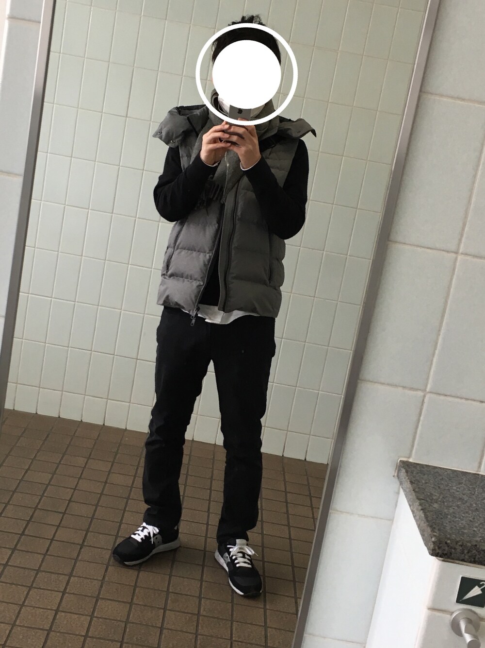 上下黒に、ダウンベストとマフラーのグレーで重くなりすぎないようにコーディネートしてみました〜 袖がない分動きやすいのがいいですね〜 サイズ ジャケット 01 スウェット S シャツ S パンツ S シューズ 26.0