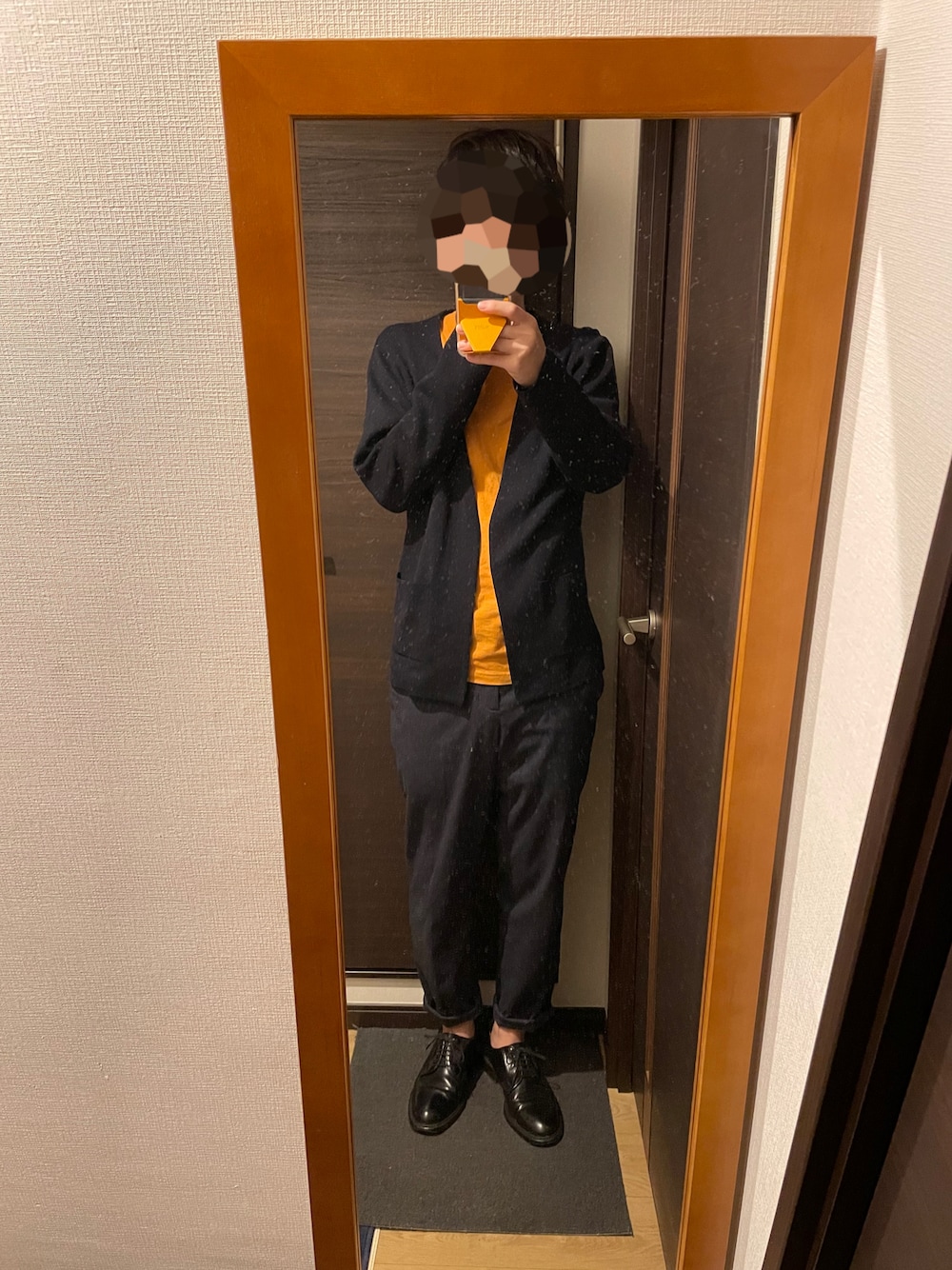 今日は例のワクチンの為に半袖Tはマストの条件... 少しでもカジュアル感が無くなるようにしつつもTシャツのオレンジと色味が合うようなネイビーのカーディガンとスラックス、革靴と合わせてみました。 あんまりかっちりしすぎても良くないかなとも思ったのでスラックスはロールアップして少しでも軽い見た目になったらなぁと思いつつ。。。 今日も一日お疲れ様でした!