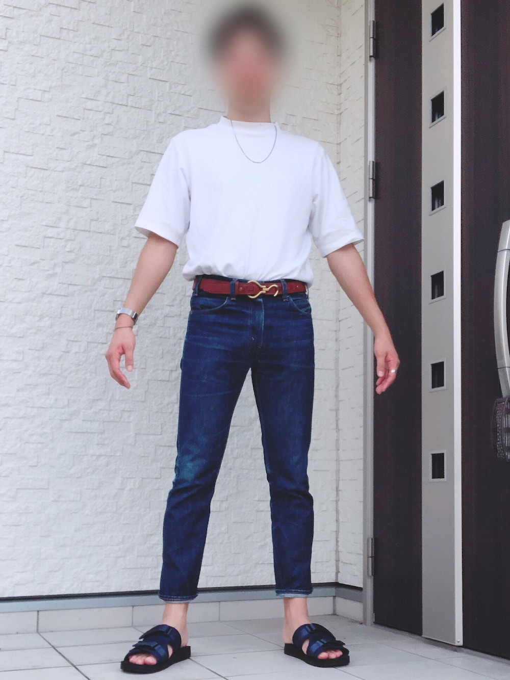 白T×デニム 白Tとデニムのシンプルなスタイルに目をひくベルトをしてアクセントを加えてみました! サンダルも夏感が出ていいですよね! ではʕ •́؈•̀ ₎