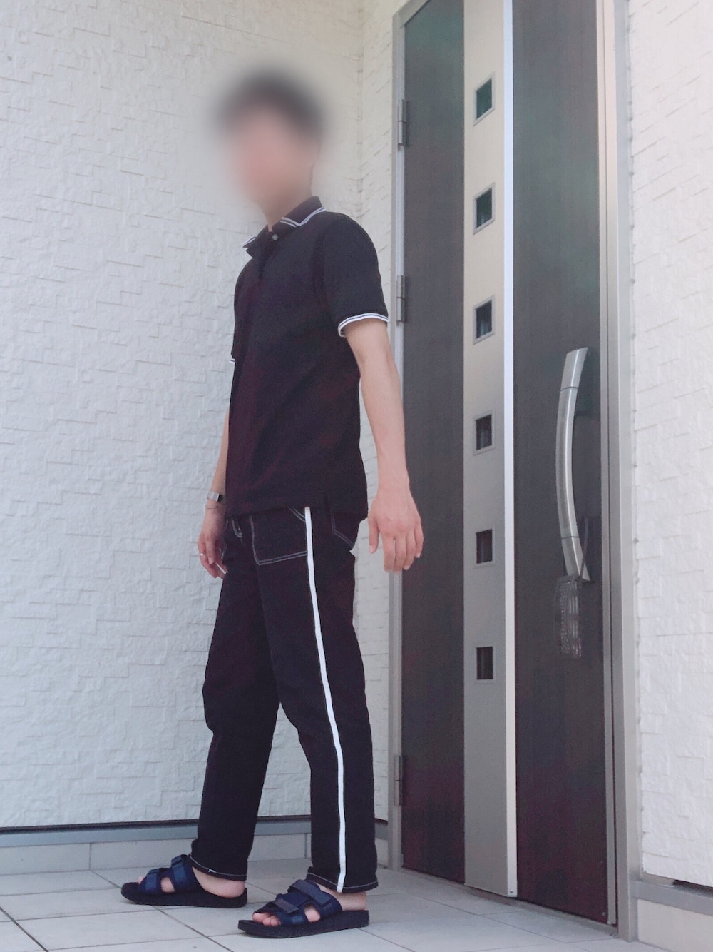 ブラックコーデ! 今日は黒に白のアクセントがあるポロシャツとパンツを合わせてみました! パンツのサイドラインが映えると思ったので横から撮ってみました! ではʕ •́؈•̀ ₎