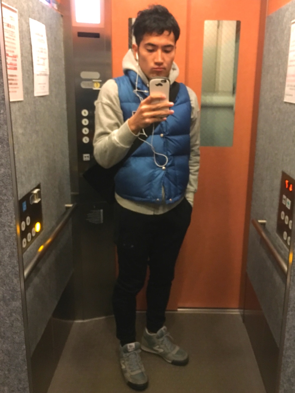 パーカーにはダウンベストっていう組み合わせ、最高だと思います。至高! 肩幅広い身分にとってはね! 無理してでもこのスタイルしたくなります! シューズはH710! バイト時代に一目惚れしてすぐ買ったなあ…