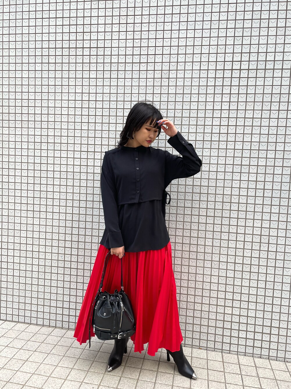 インスタ▷▷@narcissus_yumi ___________________________________ 差し色コーデ🍎 今回はビビットの赤のプリーツスカートで 大人っぽくキレイめに❣️