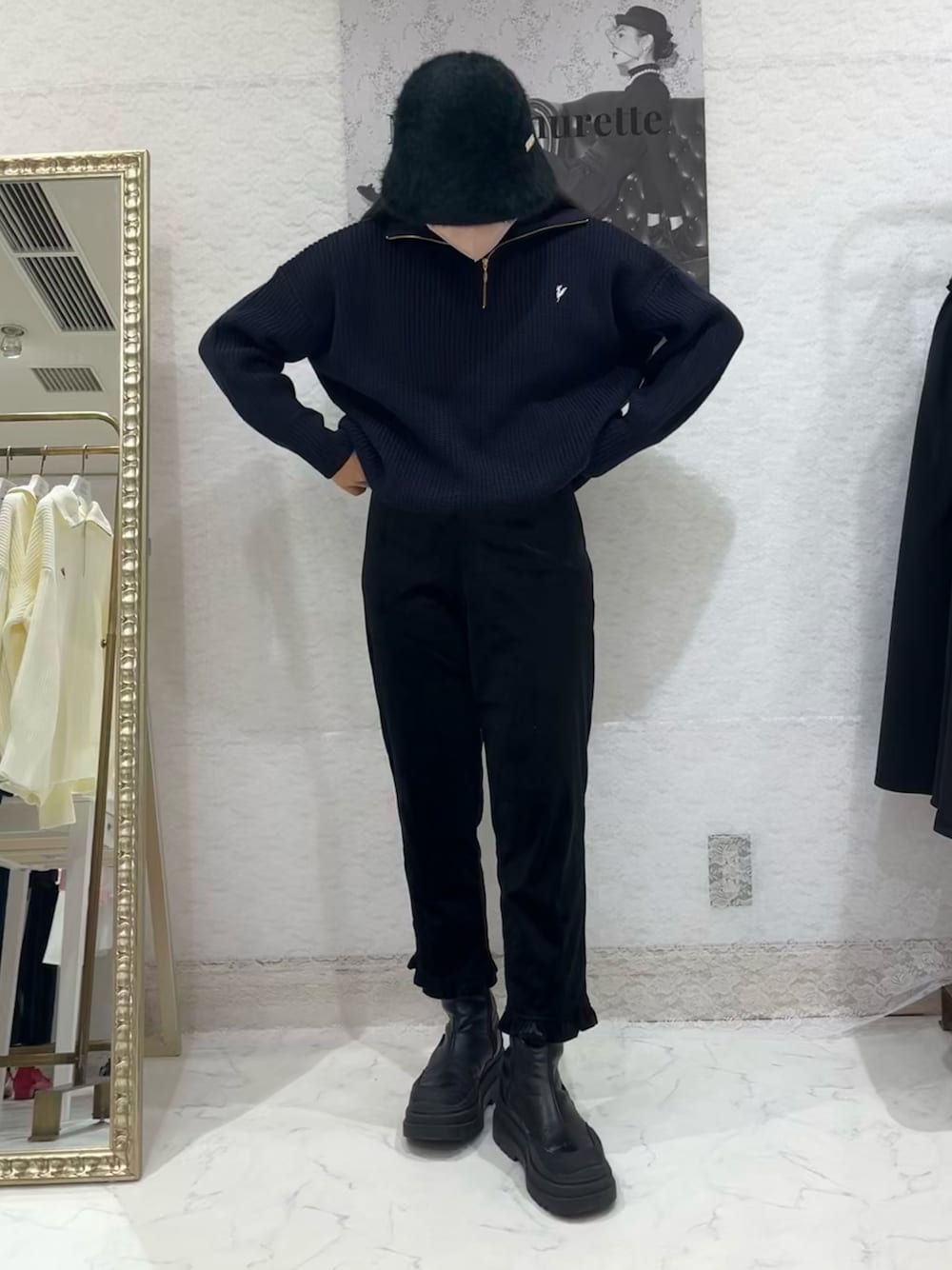 153cm coordinate🐔🪩 gm~ ご覧いただきありがとうございます! POPUPの店頭コーデ🐔💞 トレンドのハーフジップもネイビーにゴールドカラーのジッパーが可愛くてお気に入り~ カジュアルになりすぎないように裾にフリルのあるパンツで甘さも足しました✌︎ 良かったらインスタもきてください✔︎ @__vaaaa