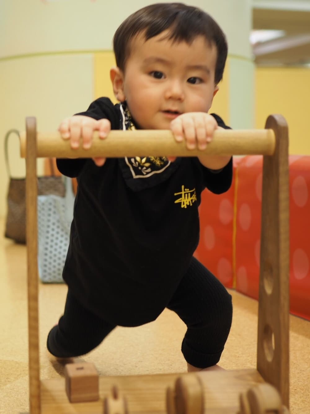 先日のスタイル。 祖母に頼み込んで、 バンダナをカスタムしてもらう事で完成したスタイ。 それを際立たせるために、全体をブラックでまとめてみました。 最近は父ちゃんや母ちゃんの力を借りることなく、 ほんの少しだけ立てるようになってきたし、 今日も気合入れて保育園いくぜ。