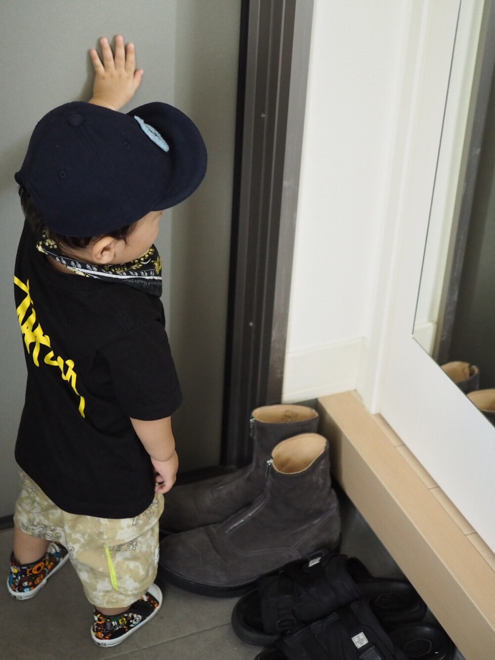 鏡の前でファッションチェック。