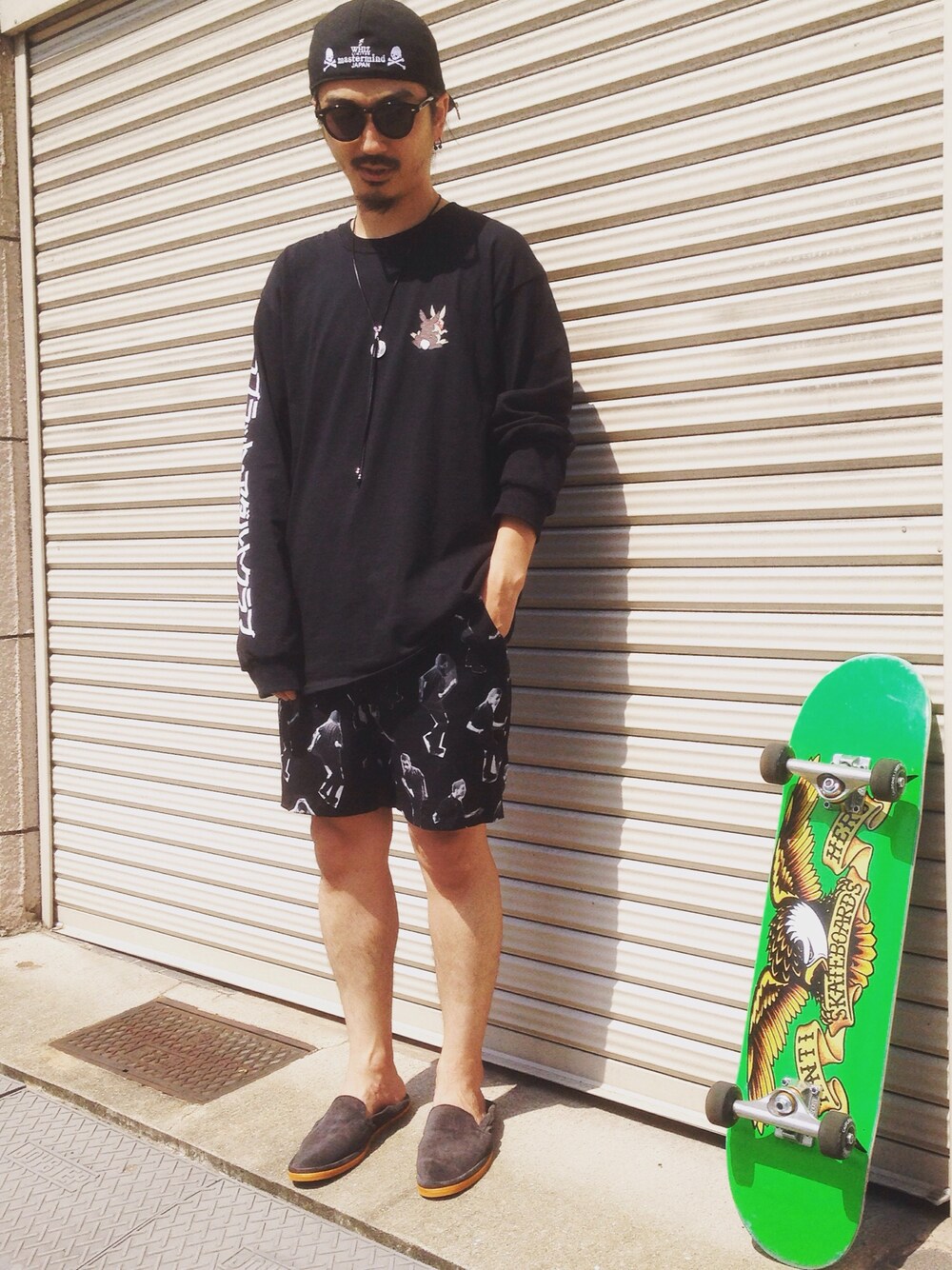 ブラック系のTシャツ/カットソーを着用したメンズの夏コーディネートの1枚目の写真