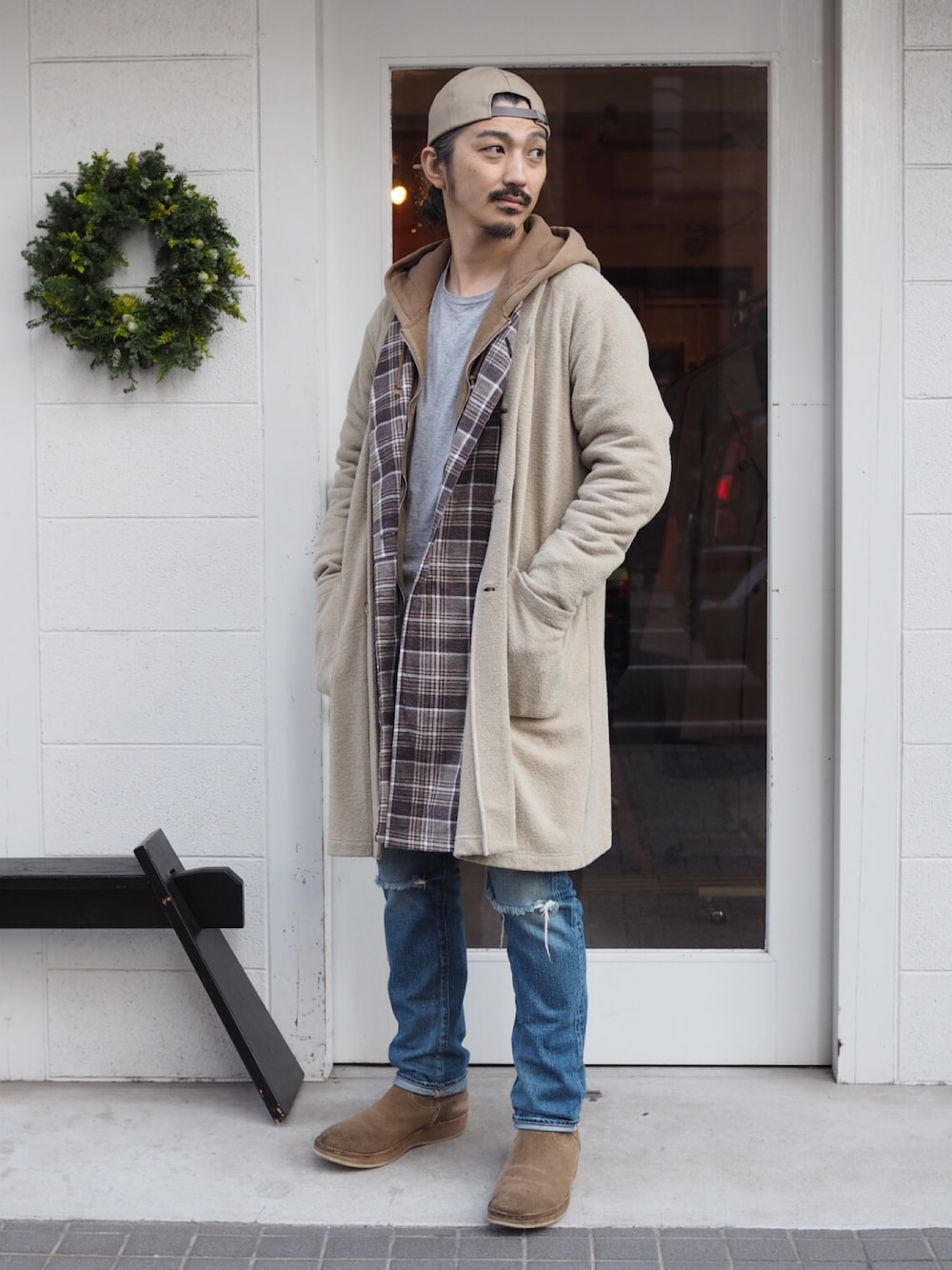 nonnativeとwhizのミックススタイル。 タンクトップ、Tシャツ、パーカーの上に、ガウンとコートを重ねた、超重ね着コーデです。