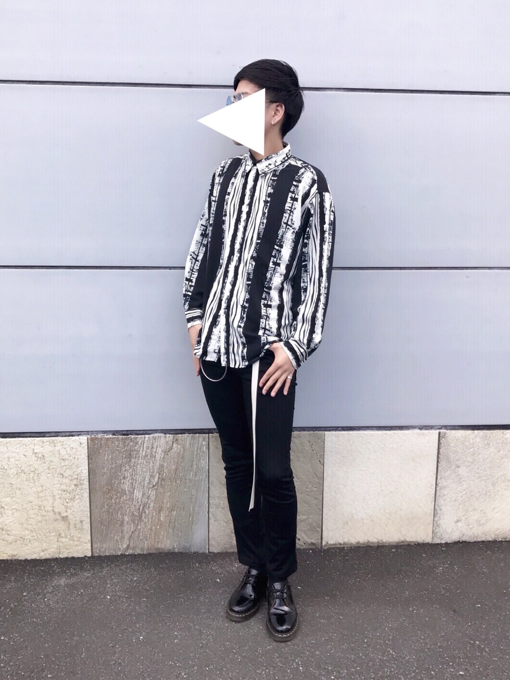 モノトーンコーデ。 古着のシャツは最近のお気に入り。
