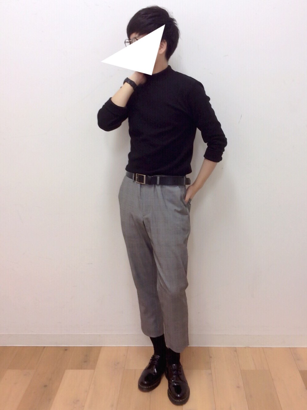 ブラック系のTシャツ/カットソー、グレー系のスラックス、ブラック系のブーツを着用したメンズの秋コーディネートの1枚目の写真